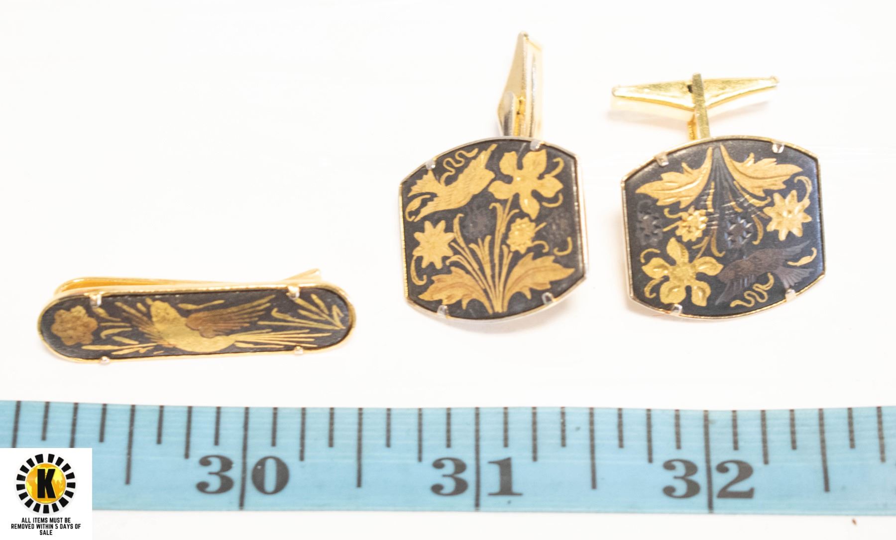 TRI GOLD ETCHED BIRDS VINTAGE CUFFLINKS & TIE BAR
