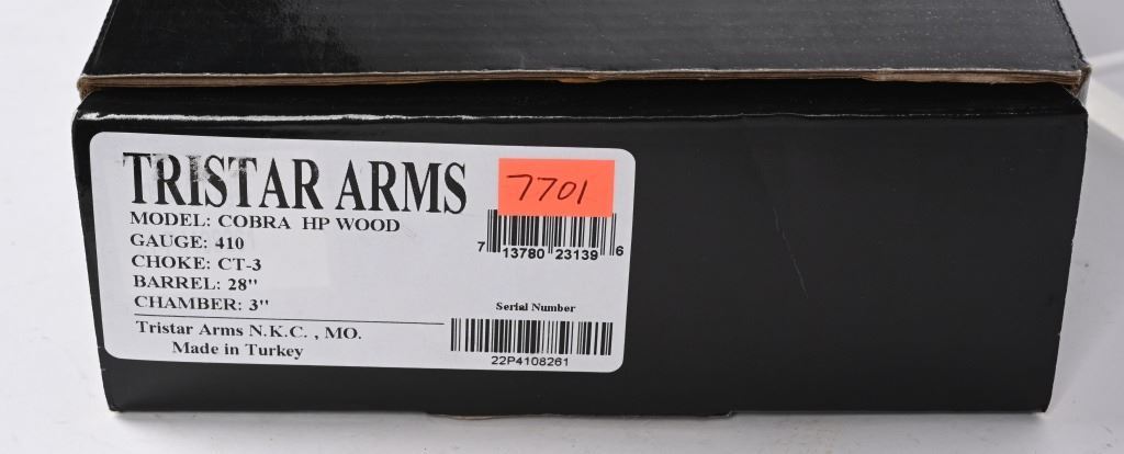 SERIAL NUMBER: 22P4108261. BARREL: 28". CALIBER: .410 GAUGE. MANUFACTURED: 2022. Made in Turkey. Full vent rib barrel with fiber optic front sight. Matte blued barrel and black aluminum receiver. Oiled wood stock with fine checkering on the wrist and forearm. 3" chamber. Removable choke tubes (includes full, modified and improved cylinder). LOP is: 14-1/4". Includes serial matching box, manual and choke tube wrench. CONDITION: Metal is excellent overall, as is the wood. Bore is shiny. Box is excellent as well. MODERN