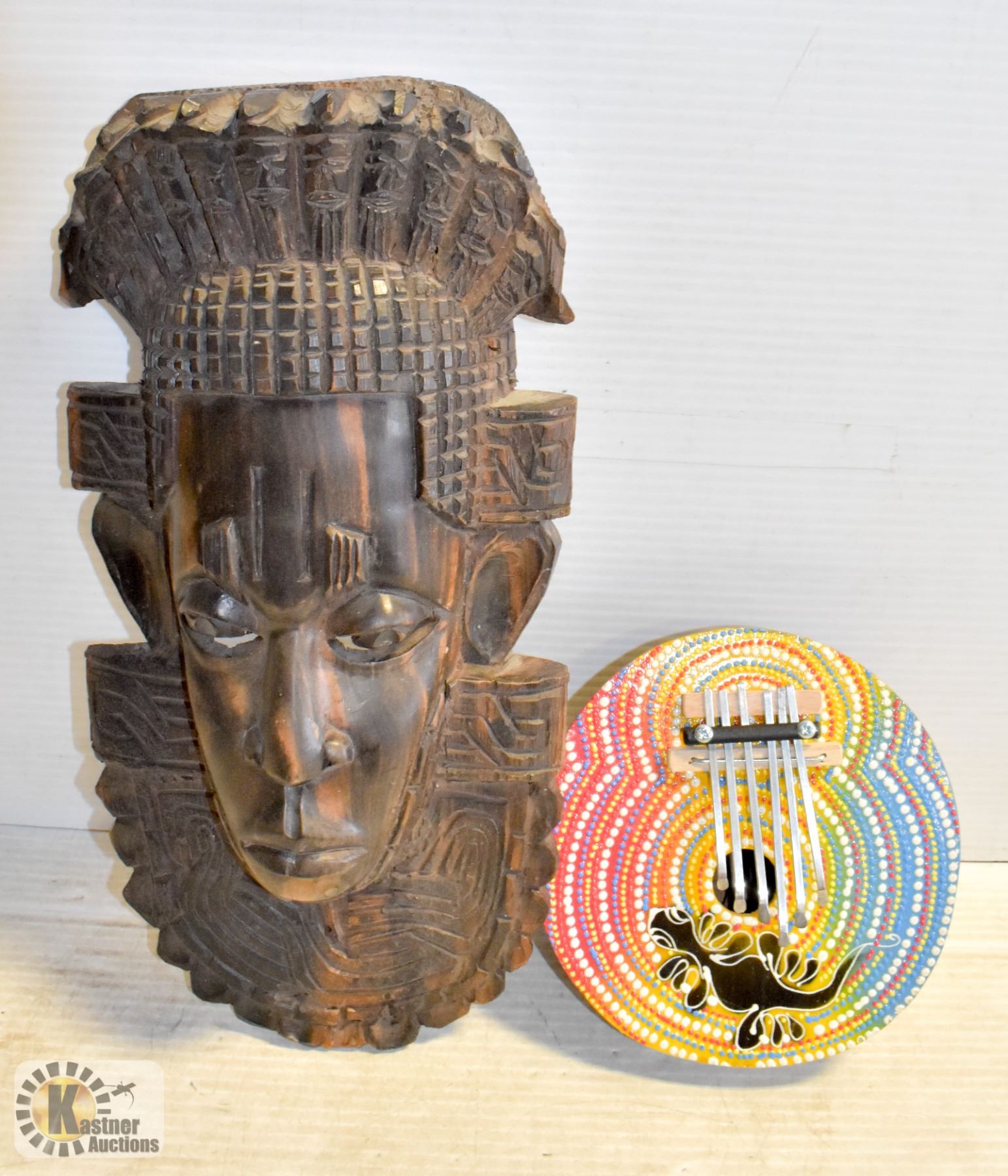 TRIBAL HEAVY WOOD CARVED WALL MASK & HAND DRUM
