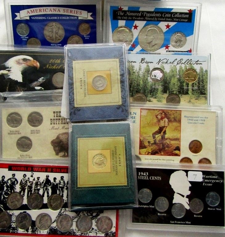 WWII STEEL PENNY SET, LIBERTY NICKEL, GOLD LAYERED INDIAN PENNY, WWII SILVER NICKEL STE, WWII LINCOLN PENNY SET, HISTORIC BUFFALO NICKEL S.D.P MINT SET, AMERICAN BISON NICKEL SET, 20th CENTURY NICKEL SET, THE HONORED