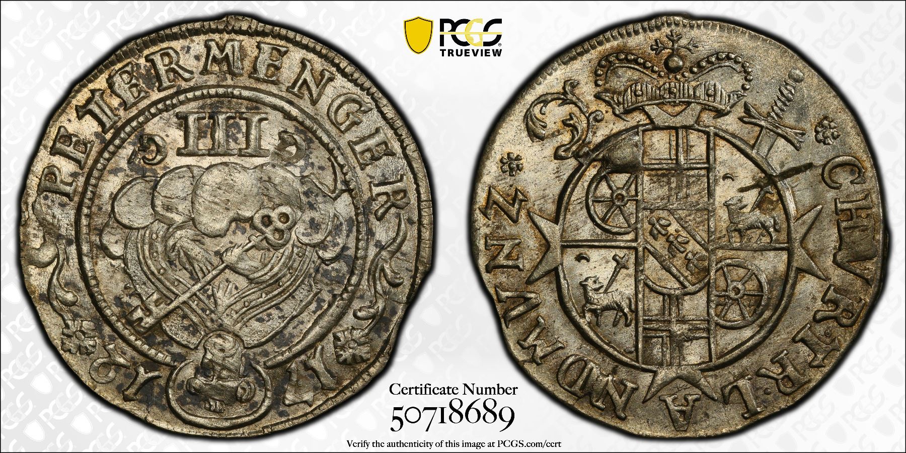 TRIER: Karl III Joseph von Lothringen, 1711-1715, AR 3 petermenger, 1712, KM-205, C-37, mint master initials GG, crowned round arms on Maltese cross // St. Peter with key and book in clouds, value below, circle surrounds all, date divided above, a lovely lustrous mint state example! PCGS graded MS63, ex Joe Sedillot Collection. In 1712, Trier was ruled by Elector Karl III Joseph von Lothringen and remained relatively stable during the broader War of the Spanish Succession. Though not directly involved in fighting, the region was affected by the war’s economic and political pressures, with the Elector playing a diplomatic role in imperial politics.
