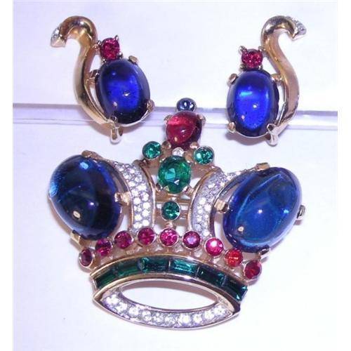 SIGNED: The brooch and earrings are marked TRIFARI (with crown) and the brooch is also marked Pat Pend 187542 ~~ SIZE: The brooch measures 1 3/4" x 1 1/2" and the earrings are 1" ~~ CONDITION: All pieces are in perfect condition, except a very minor amount of very light wear to one high spot on back of brooch. This is extremely minor, however.