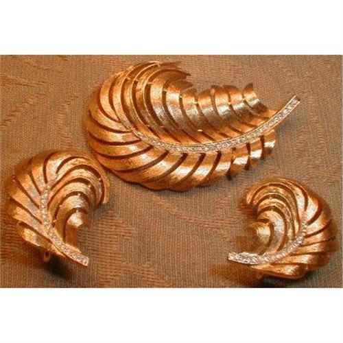 Beautiful vintage Trifari demi parure ear clips and brooch. Brushed gold