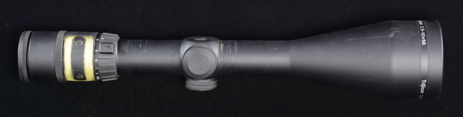 Top quality rifle scope that is ideal for low light conditions. S# R06529. Reticle is single vertical post with illuminated (ambient light and Tritium) amber triangle at top. Matte finished having 30mm tube and Euro fast focus eyepiece. Large European style 56mm objective lens for maximum light gathering capability. Click adjustments equal 1/4" at 100 yards. Versatile power band for varying applications. CONDITION: ring marks on tube plus light rub marks on front bell; overall very good with near excellent, clear optics. (02-23165/NW). $300-450.