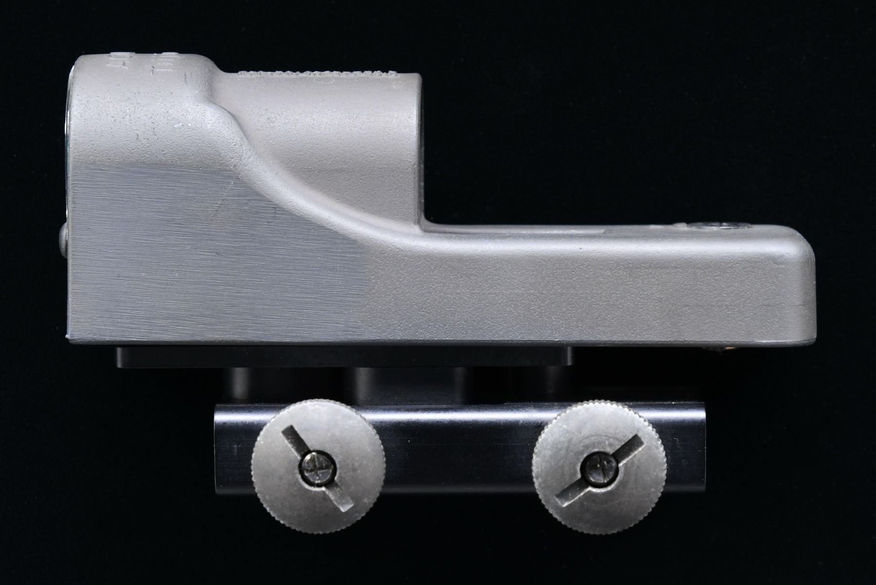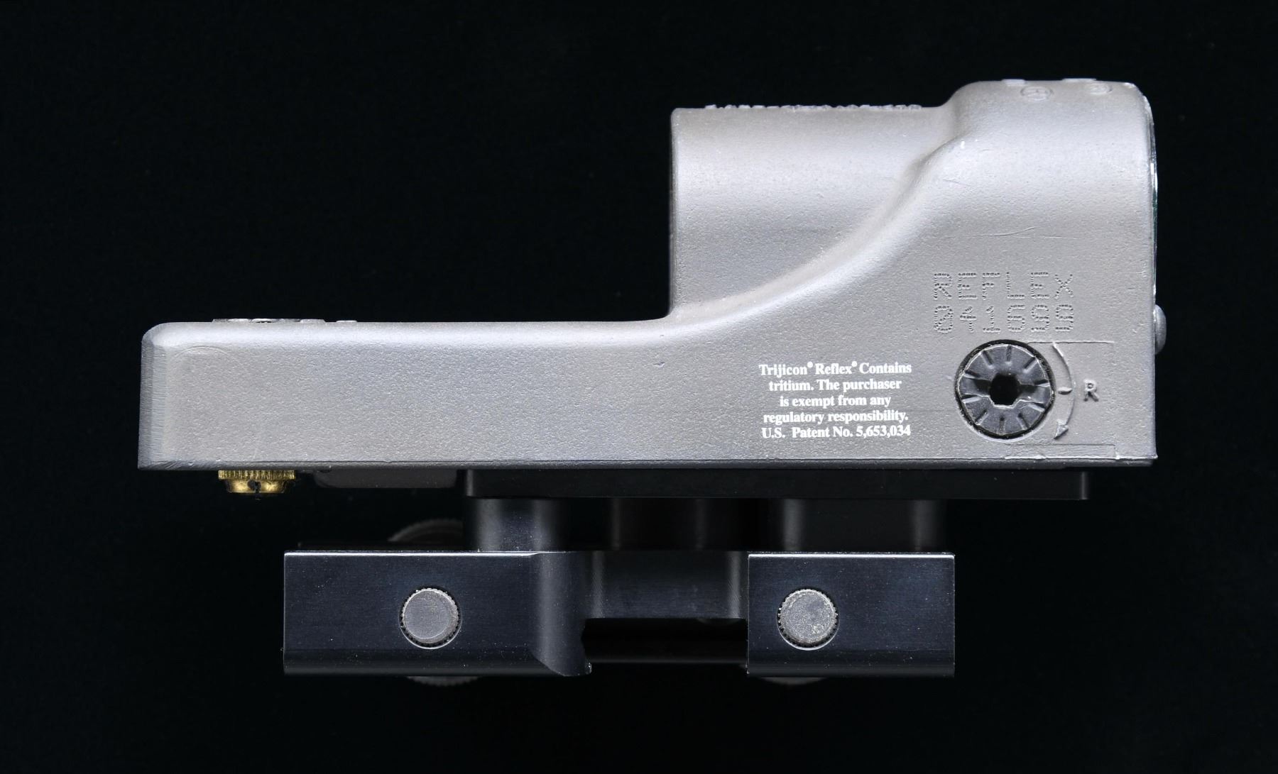 Trijicon Reflex 1x24200R46 sight w/ MPS mount for Picatinny rail. Tritium & fiber optic illumination. Amber chevron reticle. CONDITION: No obvious sign of prior use aside from some very light areas of thinning on some high spots. Glass is clear w/ sharp reticle. (02-24024/JZ). $200-300.