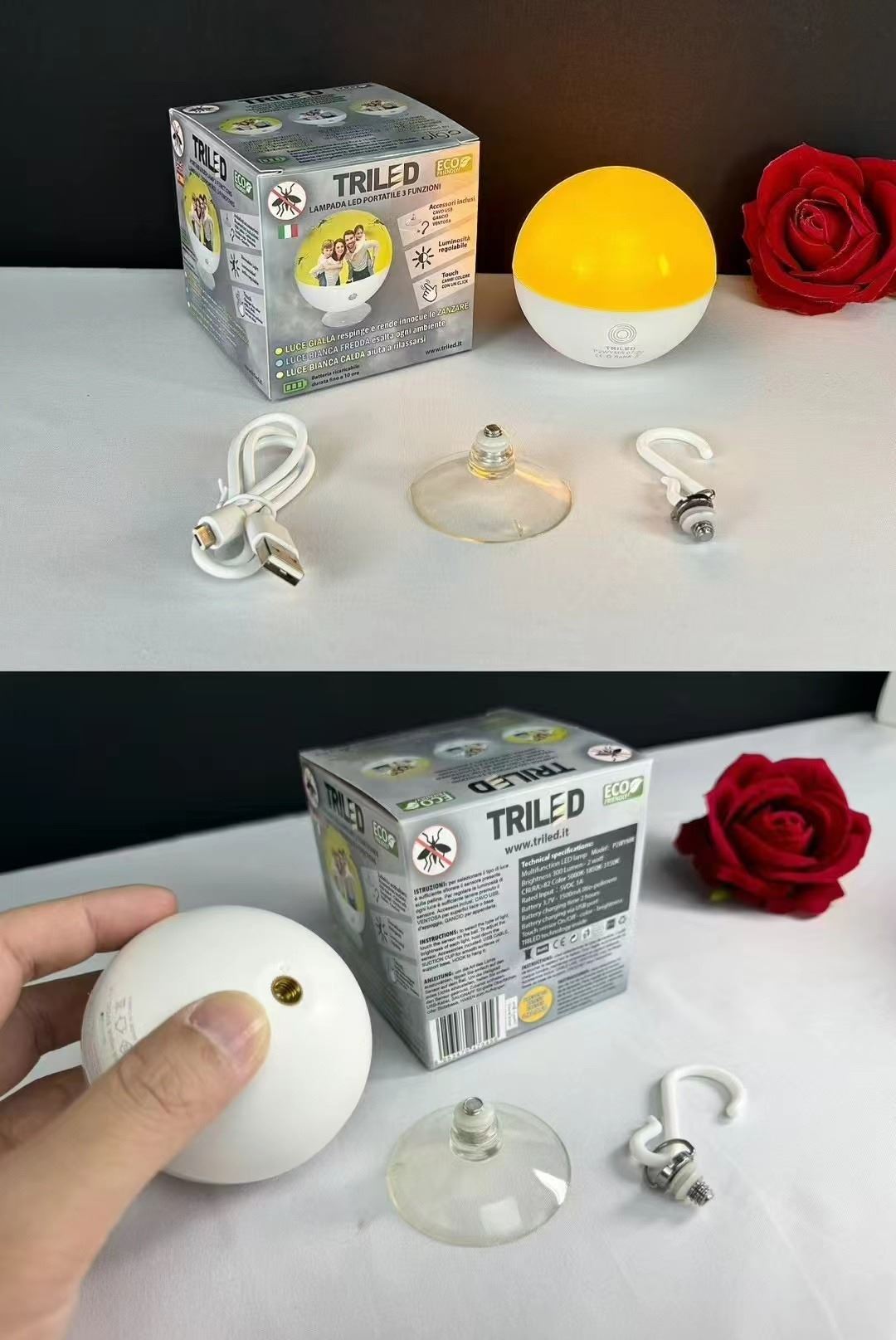 LAMP, RECHARGEABLE BATTERY. THREE TYPES OF LIGHT: COLD WHITE LIGHT, WARM WHITE LIGHT AND MOSQUITO REPELLENT YELLOW LIGHT. TOUCH SENSOR FOR ON/OFF SWITCHING, COLOUR SELECTION AND BRIGHTNESS ADJUSTMENT FOR ALL TYPES OF LIGHT.