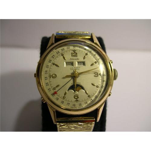 STUNNING NIVADA LAMONT CALMATIC 20 MICRON GOLD PLATED 21 RUBIES PERPETUAL CALENDAR MOONPHASE AUTOMATIC SWISS GENT'S WATCH IN EXCELLENT CONDITION BOTH COSMETICALLY AND MECHANICALLY.