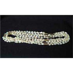 Lot 123 TRIPLE STRAND FRESH WATER PEARL NECKLACE. Necklace consists of three strands of fresh water pearls interspersed with groupings of four 4mm 14kt yellow gold beads. The three strands come together at the 14kt yellow gold clasp and feed into two 14kt yellow gold cones. SIZE: 34” l. CONDITION: Very good to excellent. 5-69470 (200-400)