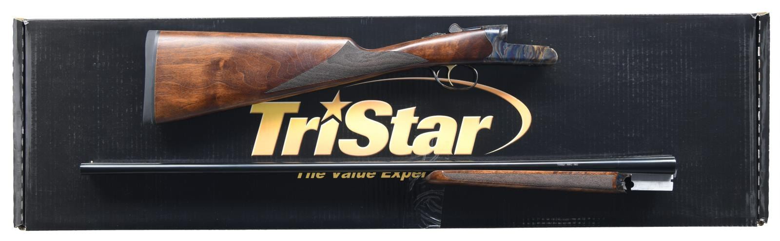 Cal. 410, 3". S# 21TB4100746. Mfg. by Khan of Turkey & imported by Tristar. Bbls. 28" w/ brass bead. Included are set of 5 Beretta Mobil interchangeable choke tubes. Case colored boxlock action w/ gold finished SST, ejectors & automatic safety. Checkered English walnut stock set w/ black recoil pad. UNATTACHED ACCESSORIES: matching numbered box containing chokes case w/ wrench, & manual. CONDITION: near excellent wood & metal finish w/ a few minor marks. Bright shiny bores. (23-1344/MD). MODERN. $500-750.