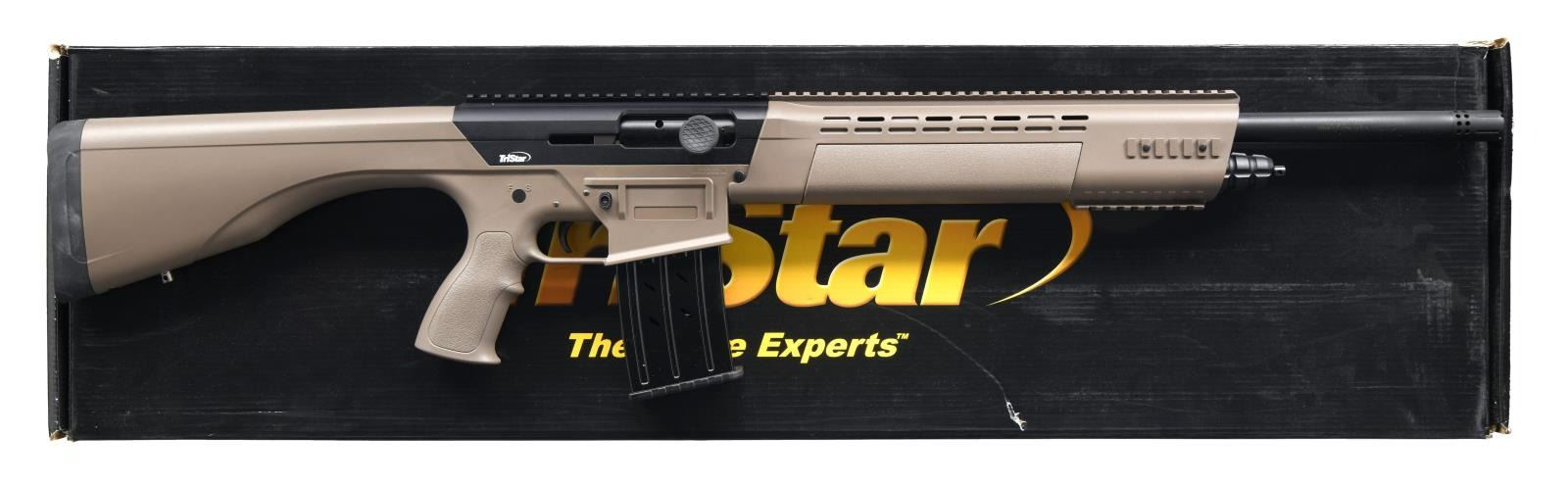 Cal 12 Ga., 3". S# KRX015878. Bbl. 20" w/ muzzle brake. AR-15 style semi auto shotgun. Dark earth furniture w/ black receiver, bolt, mag cap & bbl. Picatinny rail on top bottom of forend. MAGS: 2-10 rd. detachable. UNATTACHED ACCESSORIES: factory box matching numbered to gun, detachable AR15 style carry handle, AR15 style front sight, sight tool & manual. CONDITION: all aspects near excellent. (23-1477/MJC). MODERN. $300-400.