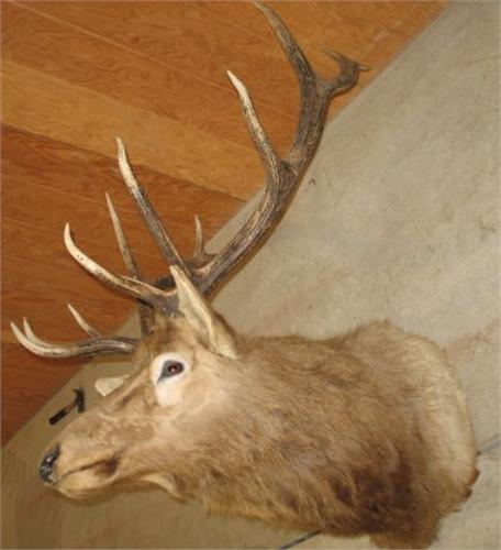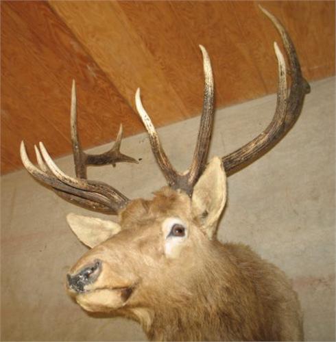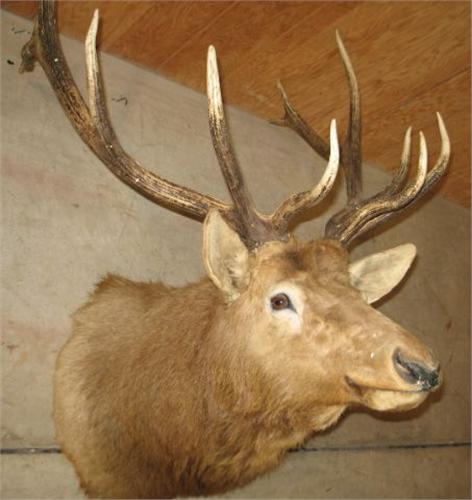TROPHY MOUNTED ELK. 12 point elk head and rack wall mount. Right antler is tagged with 1967 tag. 34.5” spread.