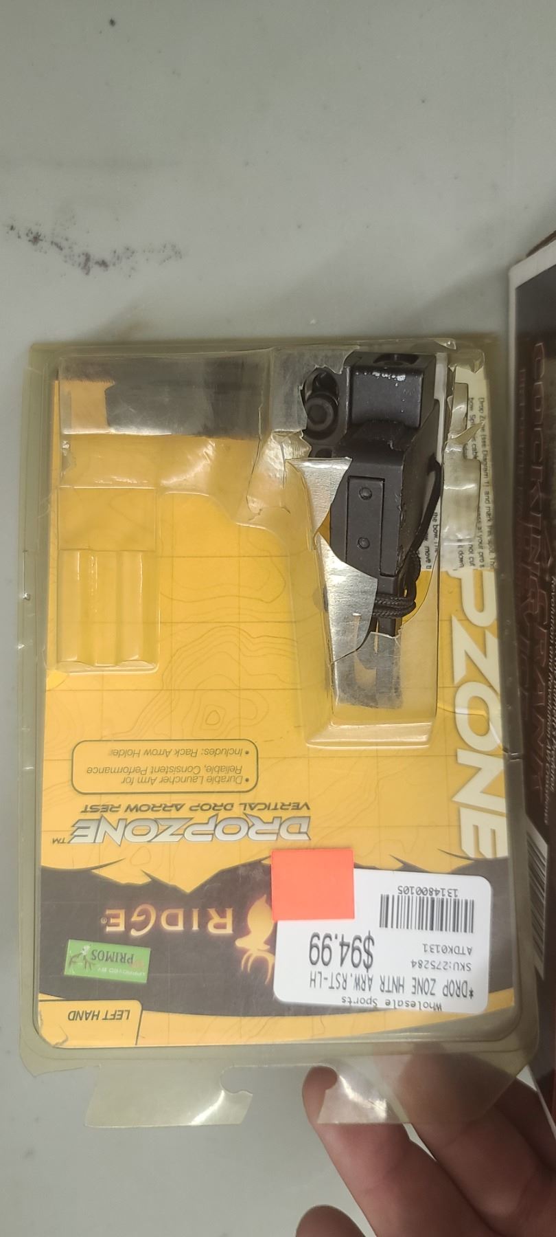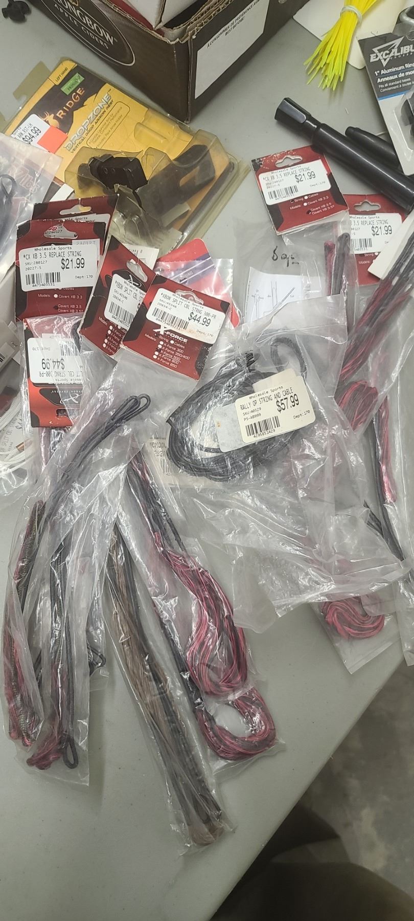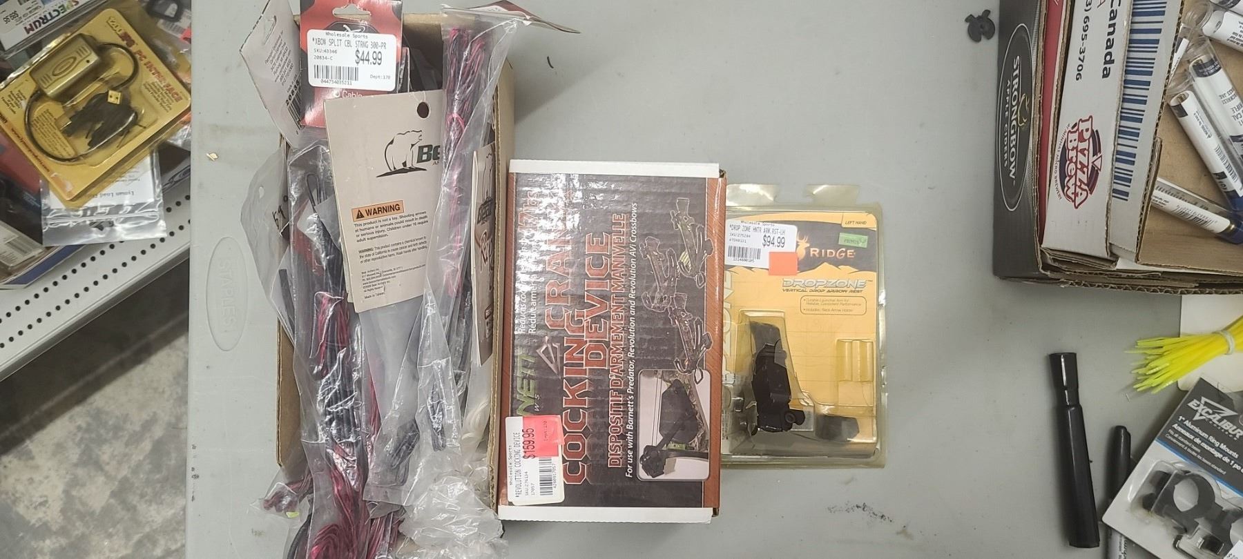 TROPHY RIDGE DROPZONE VERTICAL L-H, BARNETT 17LBS CRANK COCKING DEVICE AND AN ASSORTMENT OF CARBON EXPRESS CROSSBOW STRINGS