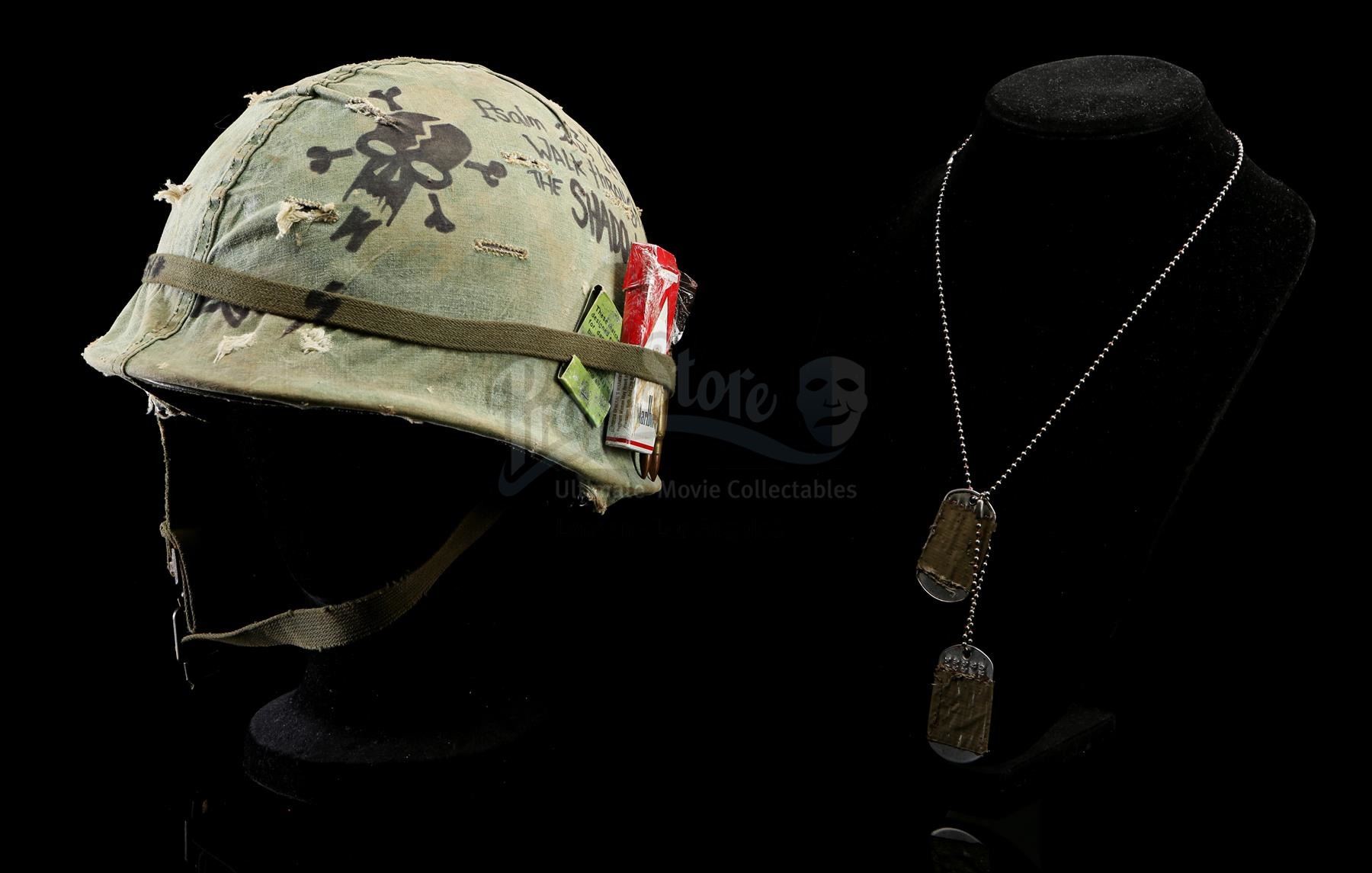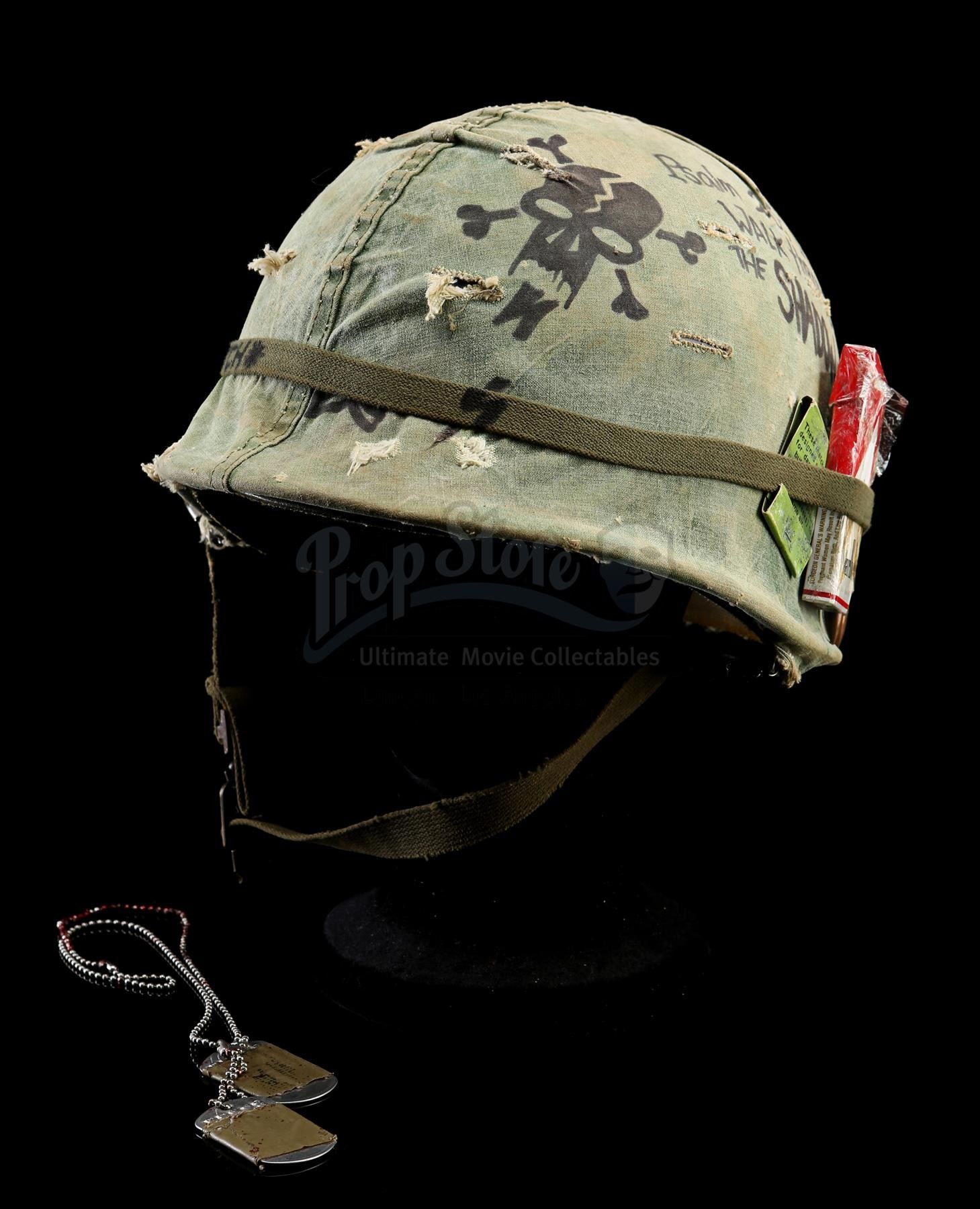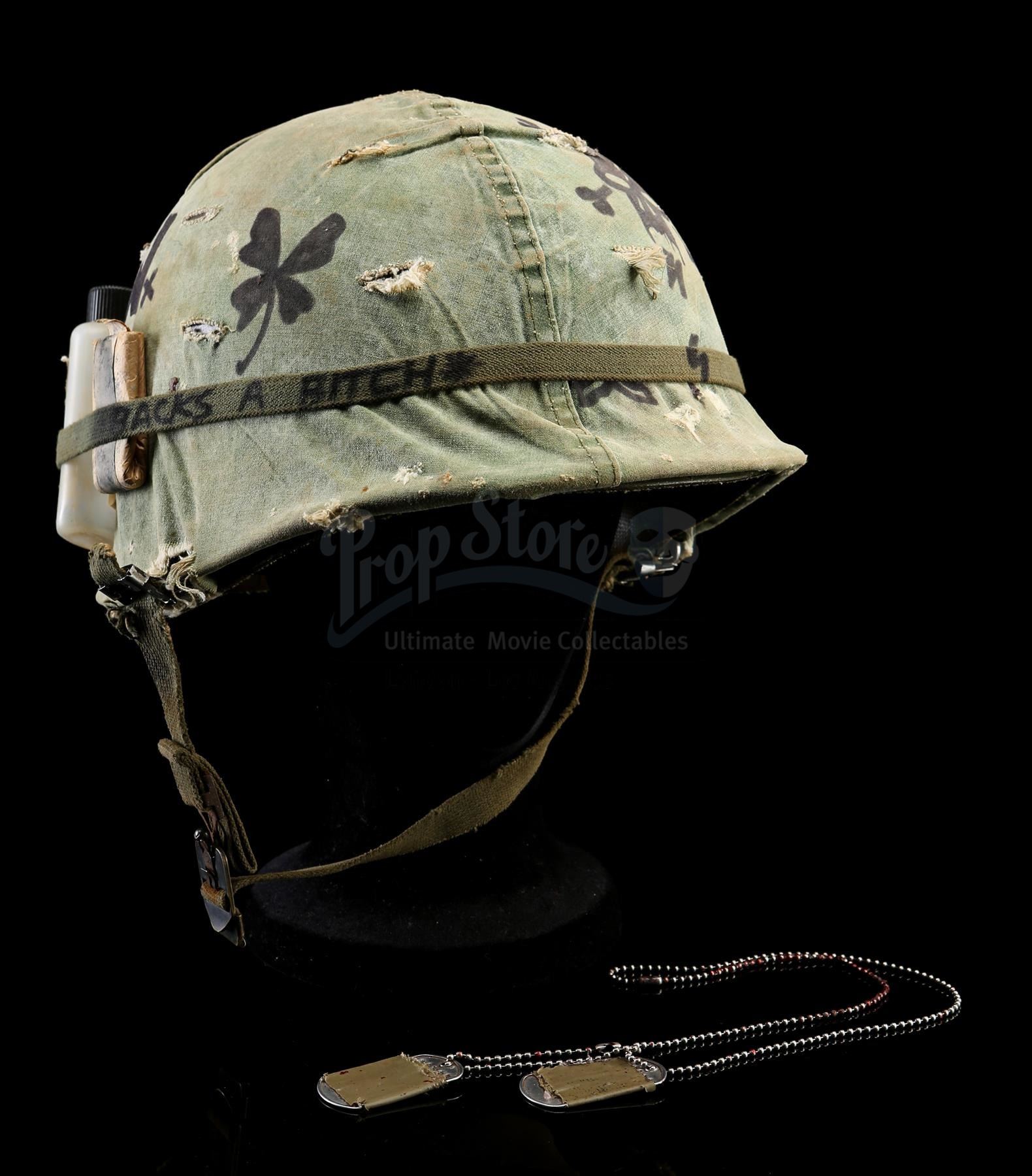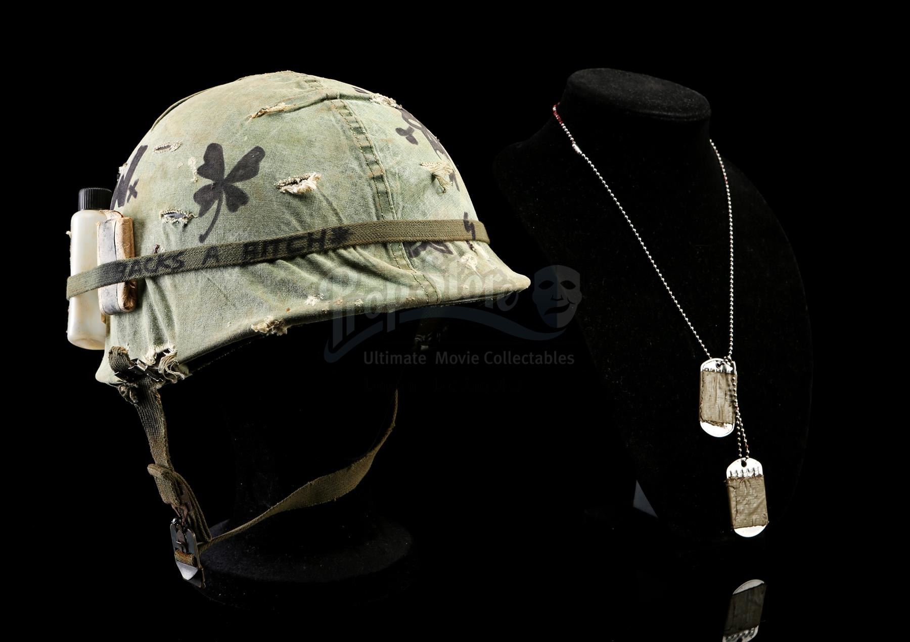 Also included are Tugg Speedman's dog tags, which are made of metal and are embossed with his name and personal statistics. The tags are wrapped in olive green tape and attached to a beaded metal chain that is dressed in stage blood. The lot shows intentional production distressing, but remains in very fine condition. Dimensions (helmet): 28 cm x 23 cm x 18 cm (11'' x 9'' x 7'')