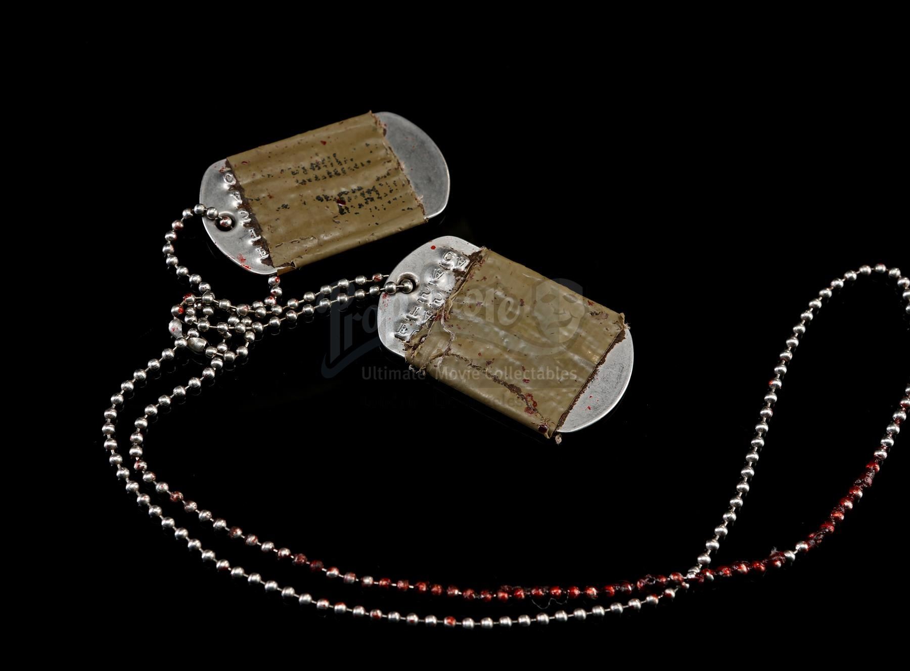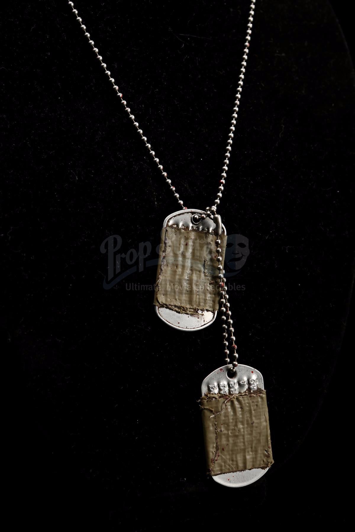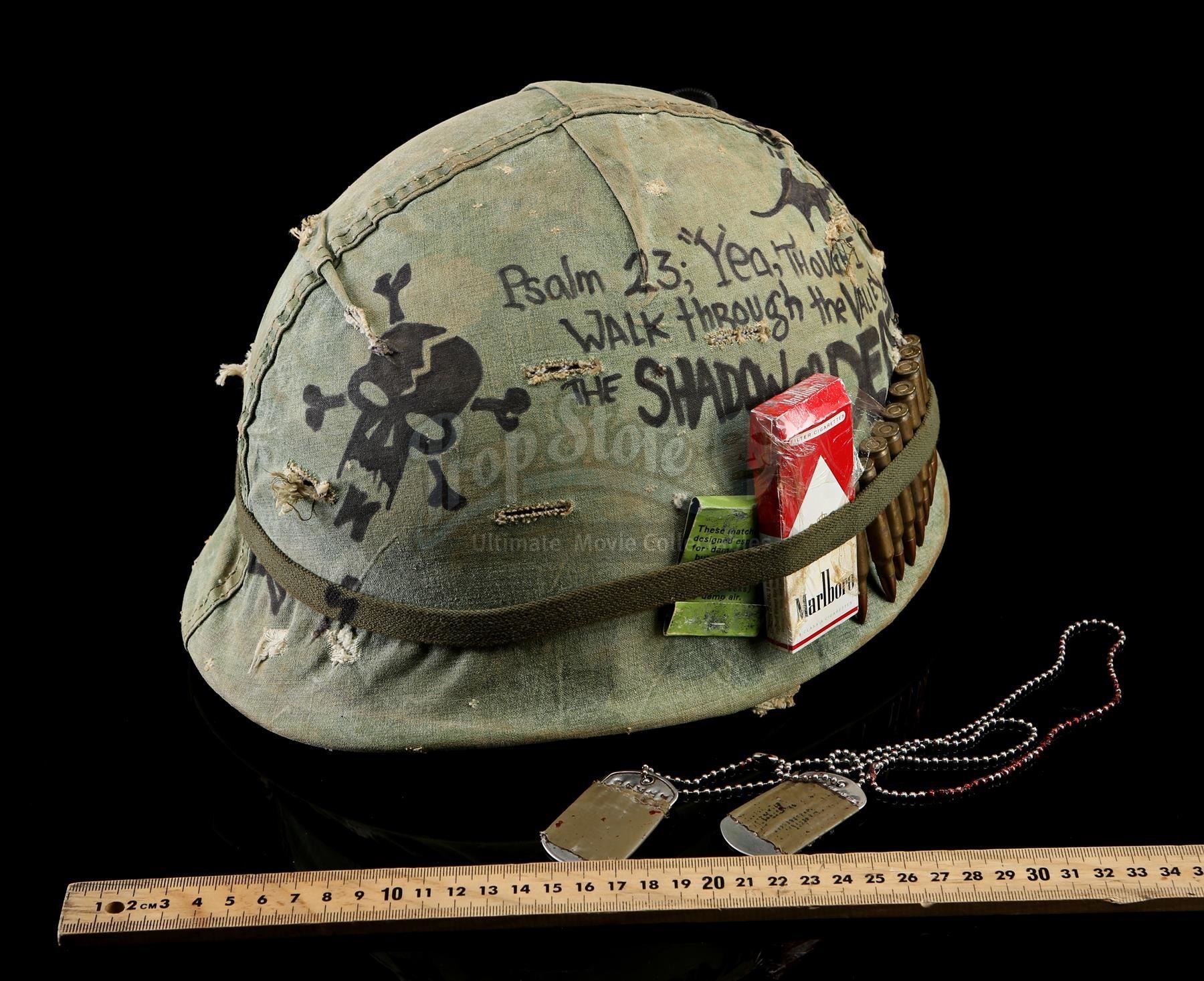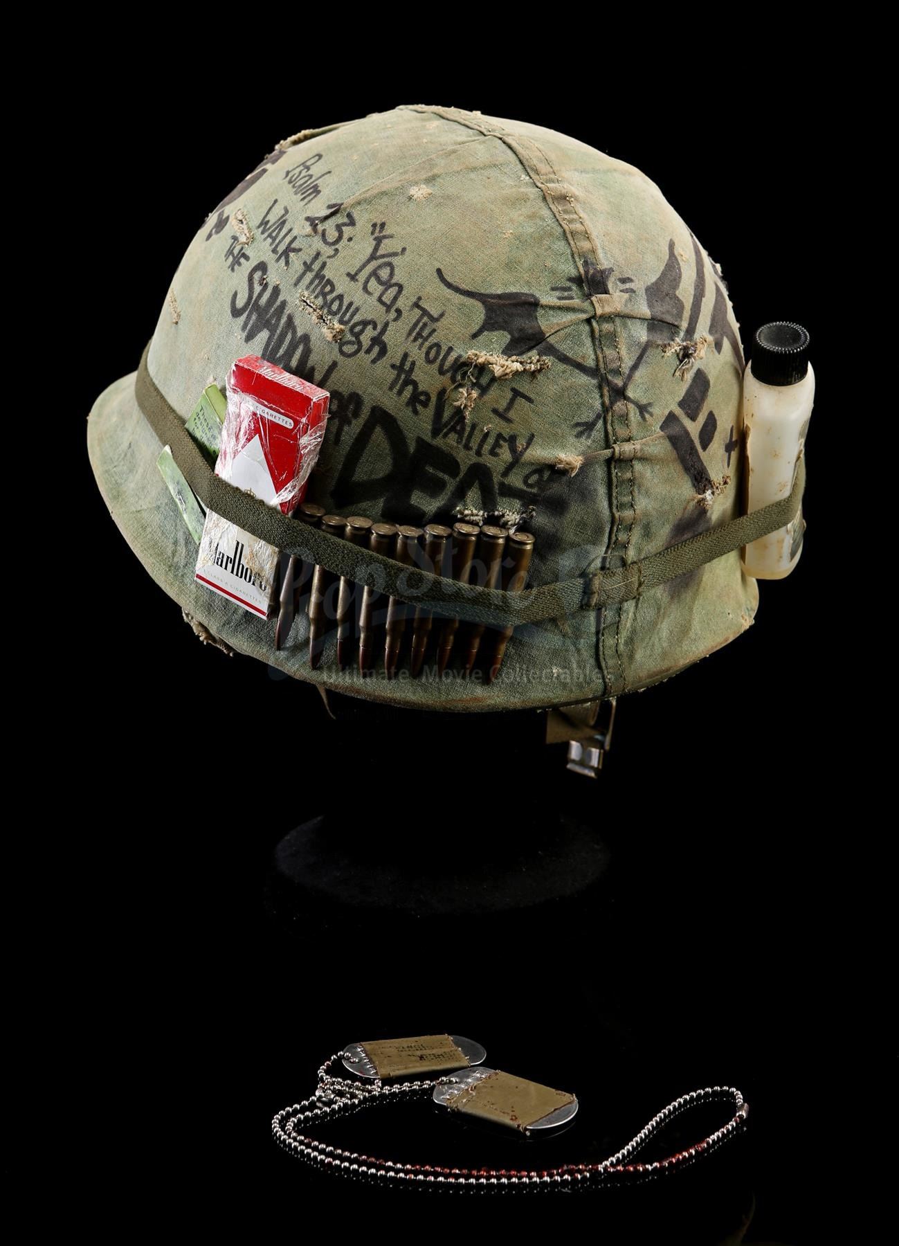 Also included are Tugg Speedman's dog tags, which are made of metal and are embossed with his name and personal statistics. The tags are wrapped in olive green tape and attached to a beaded metal chain that is dressed in stage blood. The lot shows intentional production distressing, but remains in very fine condition. Dimensions (helmet): 28 cm x 23 cm x 18 cm (11'' x 9'' x 7'')