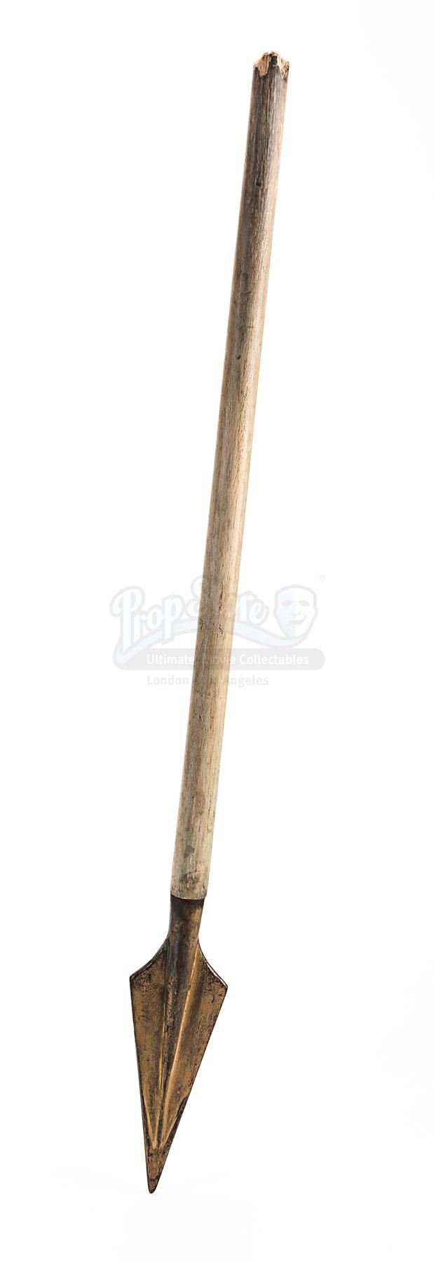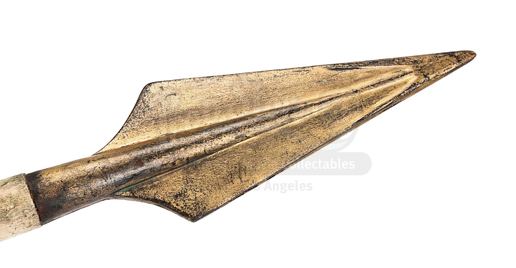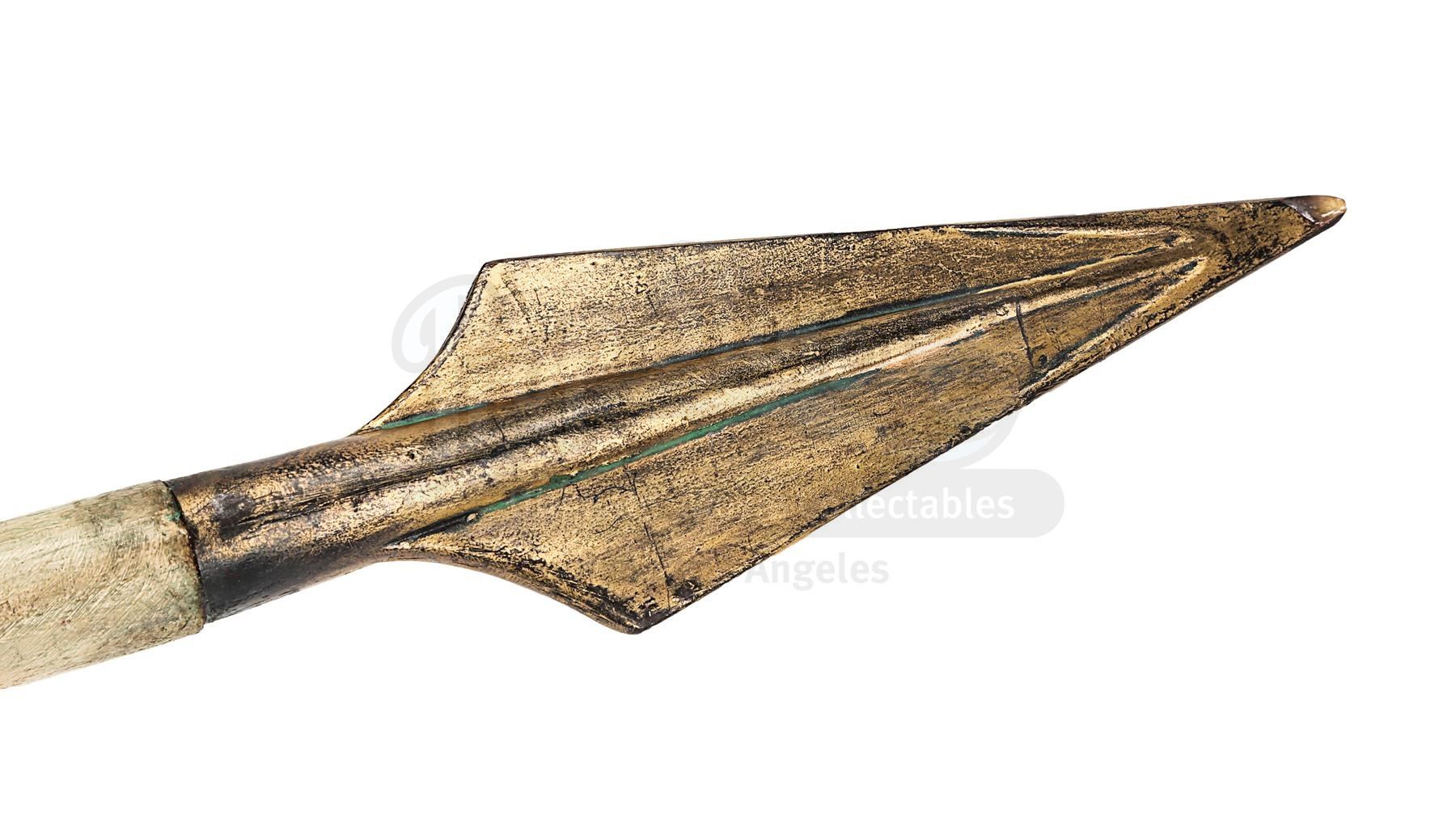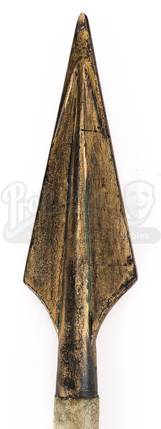 The weapon comprises a pointed spearhead made from resin and a light wooden shaft. Intentionally distressed, the spearhead has been painted in shades of faux gold to produce the appearance of worked bronze, and the shaft has been deliberately broken, leaving an exposed splintered end. The head features remnants of green paint, which has been added to produce a verdigris effect. Several marks adorn the shaft and the lot shows minor paint wear, while an exposed section of resin is present on the tip of the spearhead. Dimensions: 82.5 cm x 7 cm x 3 cm (32 1/2" x 2 3/4" x 1 1/4")