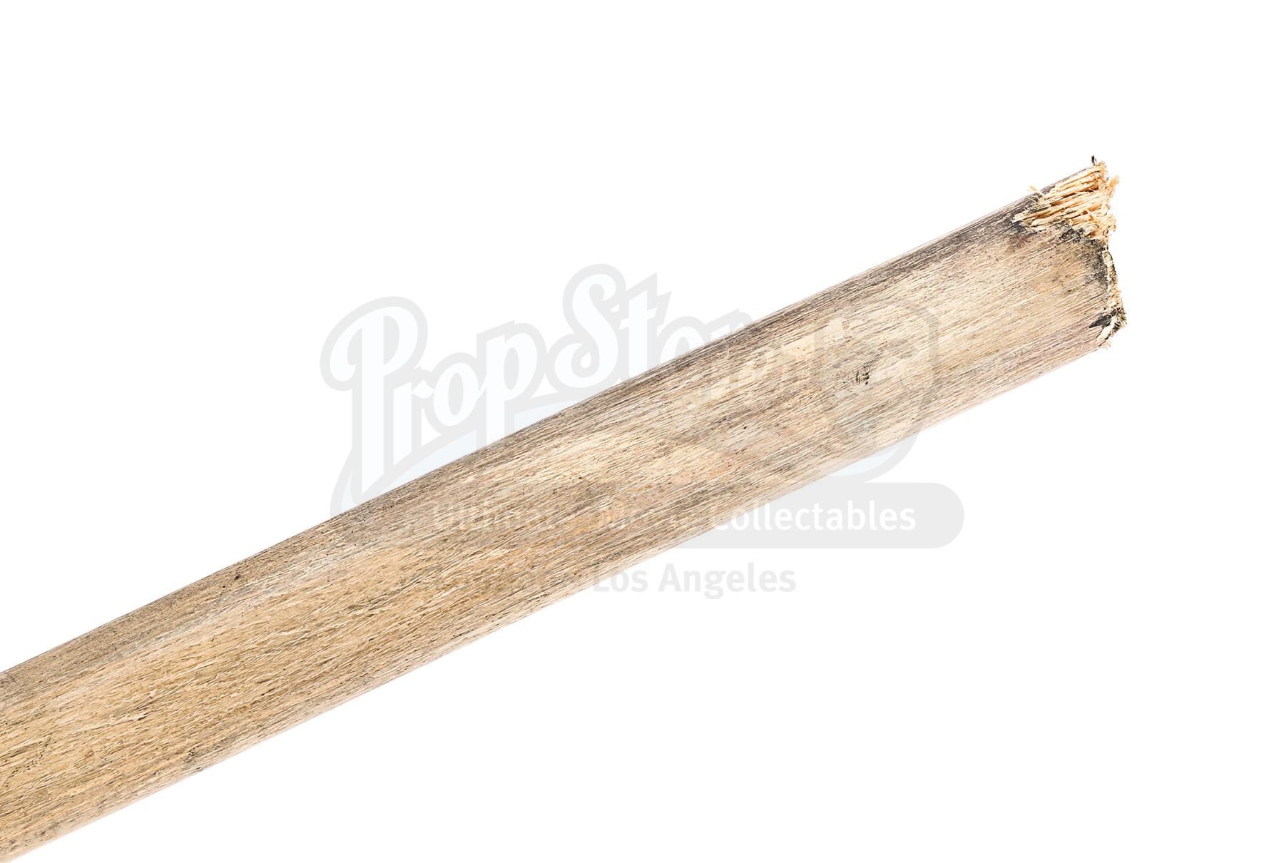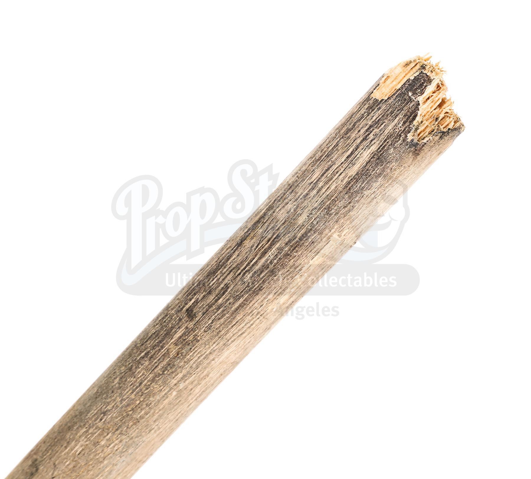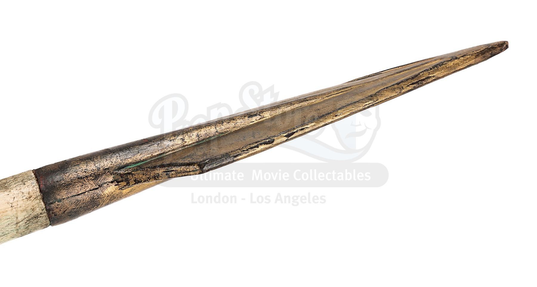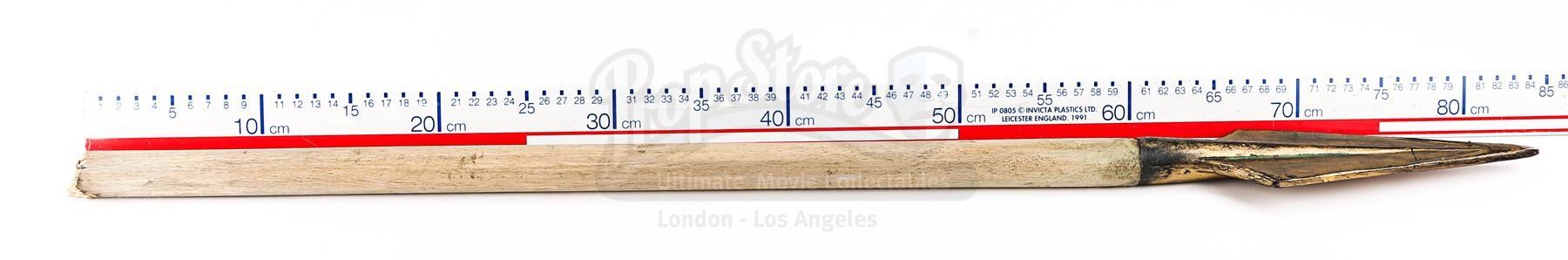 The weapon comprises a pointed spearhead made from resin and a light wooden shaft. Intentionally distressed, the spearhead has been painted in shades of faux gold to produce the appearance of worked bronze, and the shaft has been deliberately broken, leaving an exposed splintered end. The head features remnants of green paint, which has been added to produce a verdigris effect. Several marks adorn the shaft and the lot shows minor paint wear, while an exposed section of resin is present on the tip of the spearhead. Dimensions: 82.5 cm x 7 cm x 3 cm (32 1/2" x 2 3/4" x 1 1/4")
