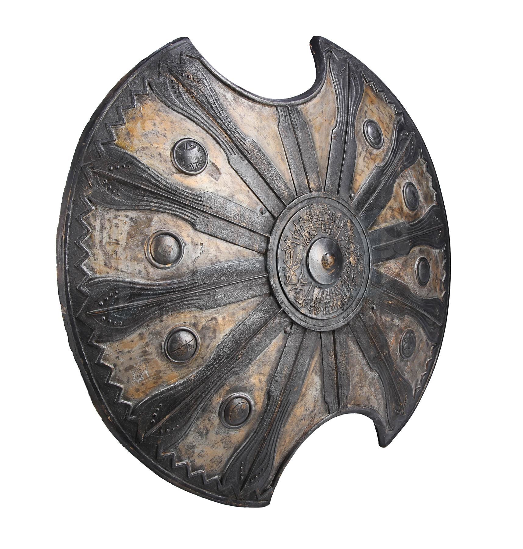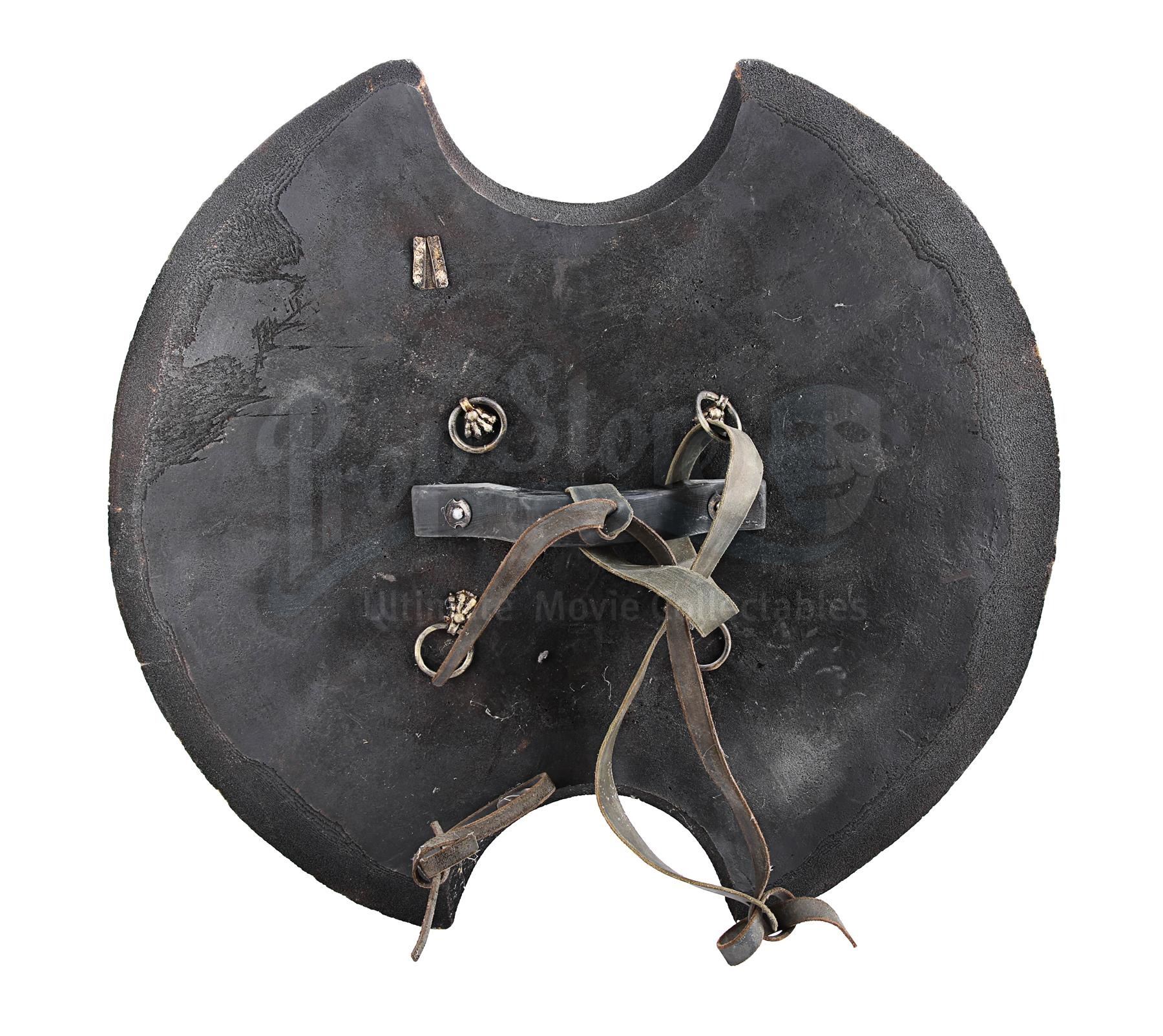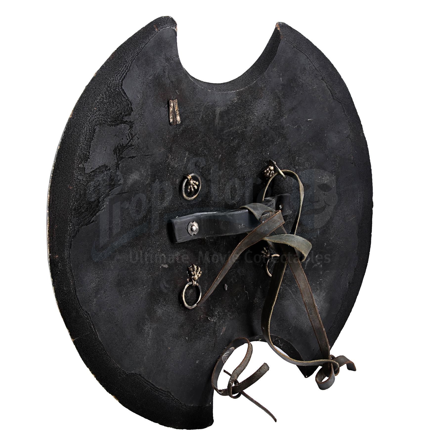 Made of biscuit foam, the shield is round with two semi-circular cut-outs on opposing sides, which allowed Achilles to thrust with a spear while still protecting himself. Finished in black and faux-bronze paint, the face of the shield features intricate figures at war around the centre, with eight discs situated above them. A black wooden handle is affixed to the rear, alongside a strip of thick leather binding and four faux-gold rings. Signs of production use are present on the lot, including light scuffs around the edge and minor paint wear. Dimensions: 81.5 cm x 81.5 cm x 11 cm (32" x 32" x 4 1/4")