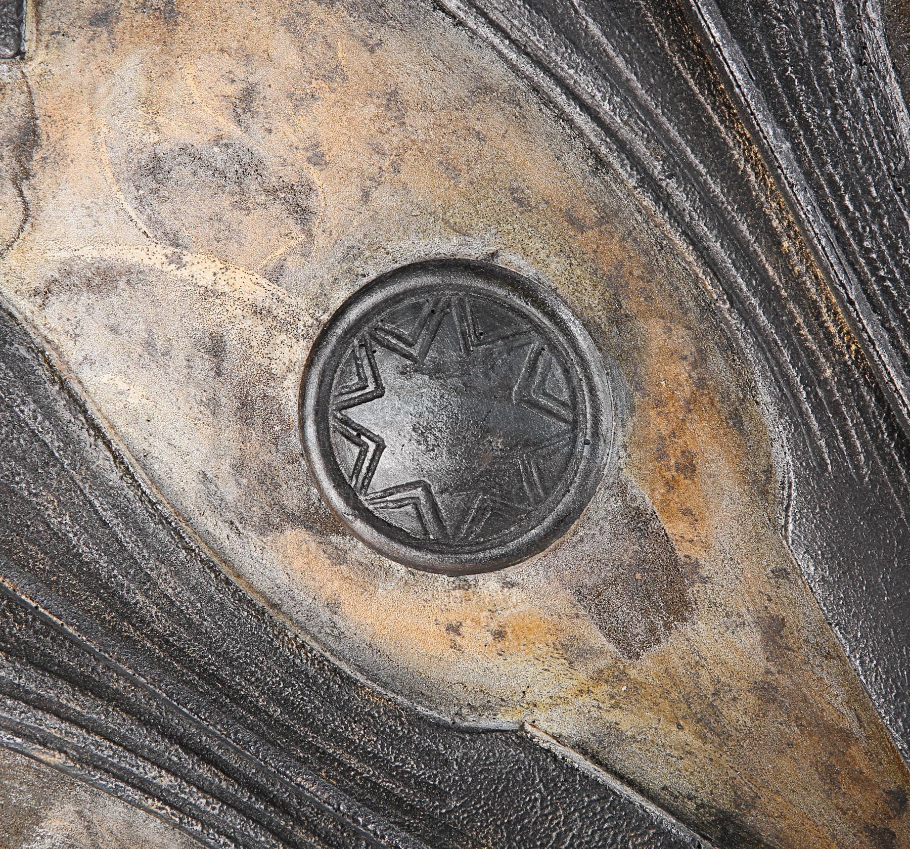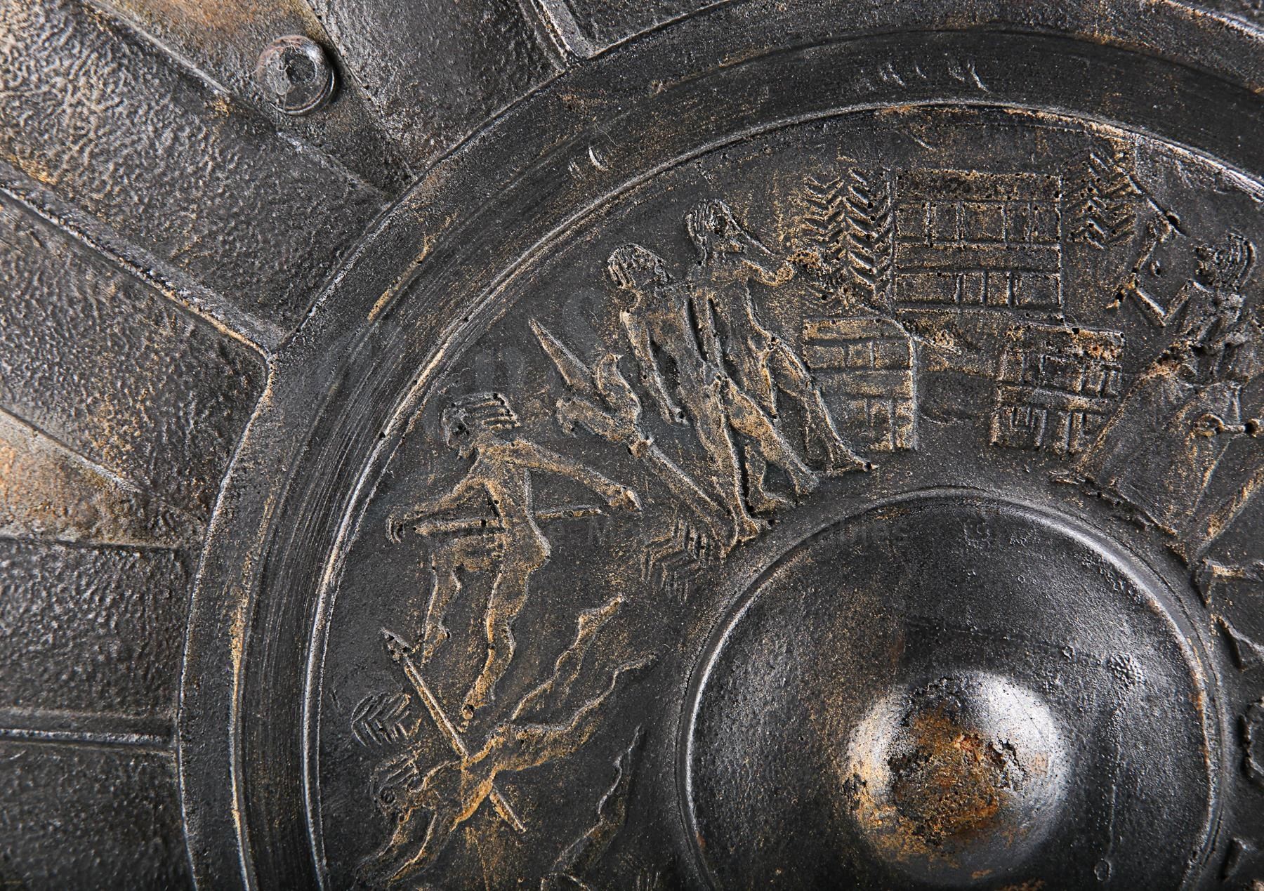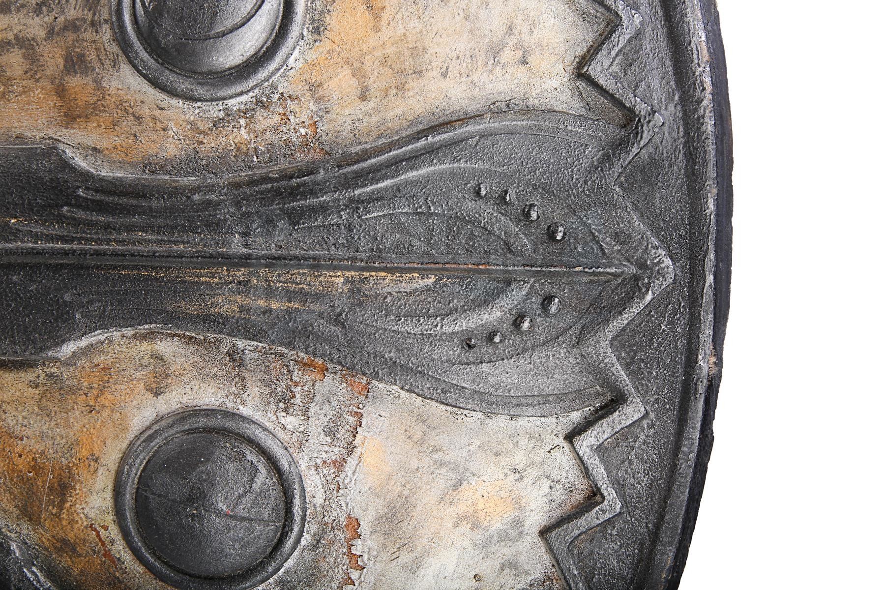 Made of biscuit foam, the shield is round with two semi-circular cut-outs on opposing sides, which allowed Achilles to thrust with a spear while still protecting himself. Finished in black and faux-bronze paint, the face of the shield features intricate figures at war around the centre, with eight discs situated above them. A black wooden handle is affixed to the rear, alongside a strip of thick leather binding and four faux-gold rings. Signs of production use are present on the lot, including light scuffs around the edge and minor paint wear. Dimensions: 81.5 cm x 81.5 cm x 11 cm (32" x 32" x 4 1/4")