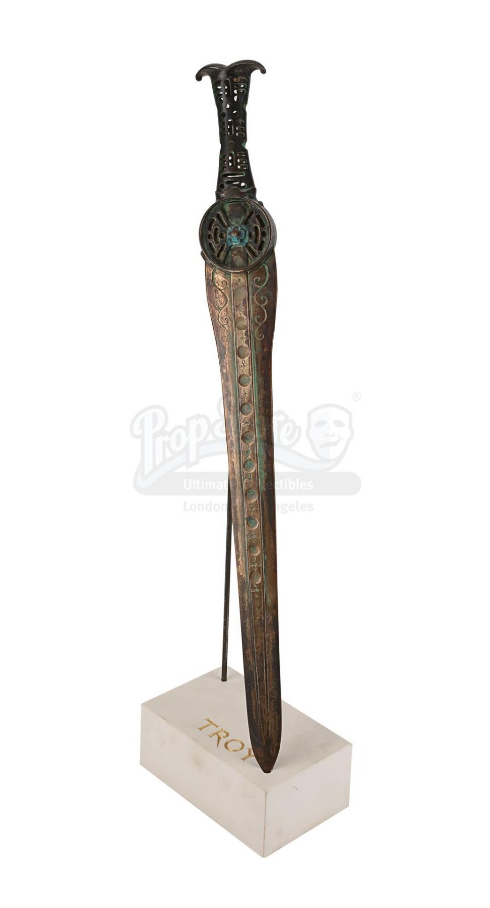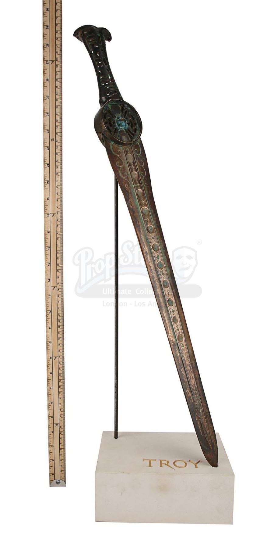 The weapon comes with a custom-made display stand, made in the production's workshops, featuring a plaster base finished in white paint, with the film-title artwork in faux gold. Intentionally distressed to produce a worn appearance, the sword displays minor scuffing and wear on the blade from production use. Dimensions (displayed): 21 cm x 13 cm x 76 cm (8 1/4" x 5 1/4" x 30")
