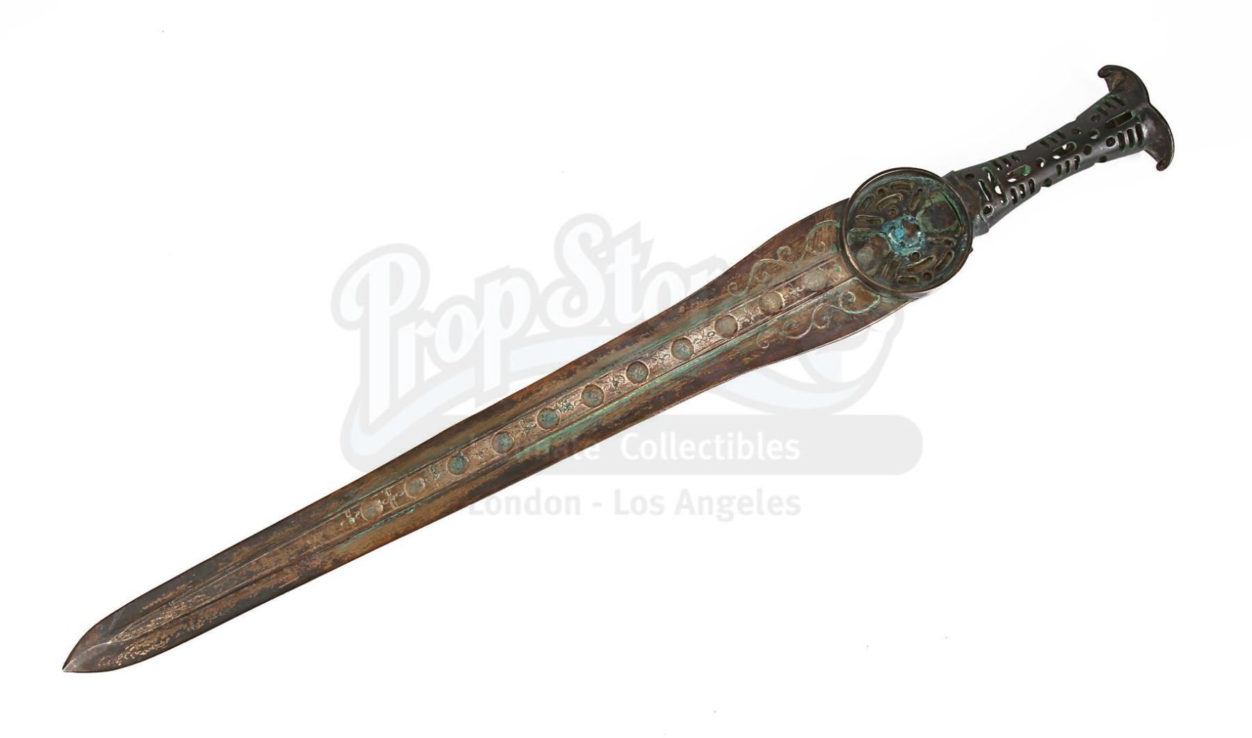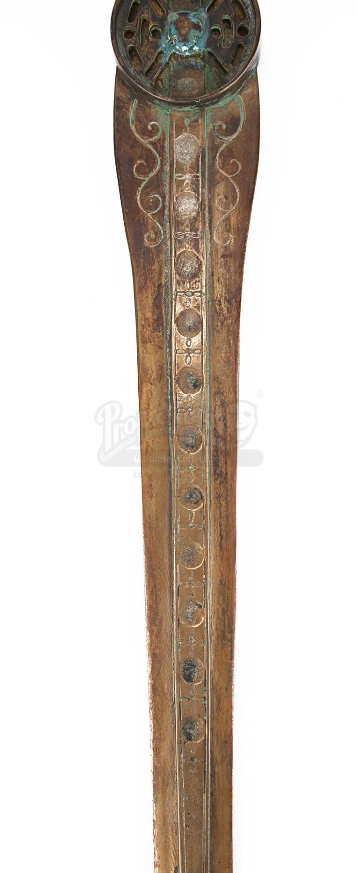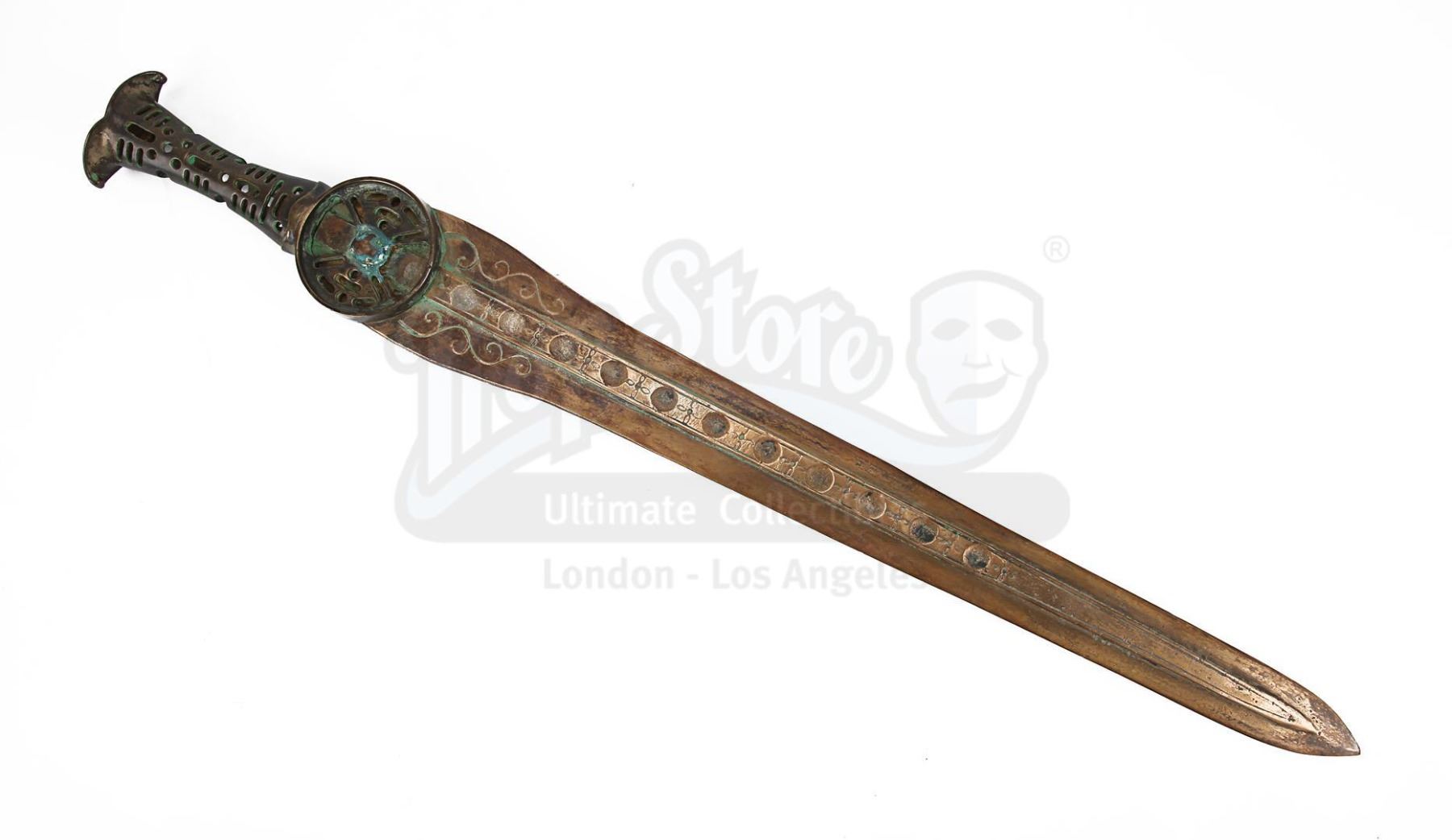 Made from metal finished in faux bronze, the heavyweight sword comprises a round guard, a grip featuring several intricate cutouts, and a fishtail pommel. The blade is decorated with several circular indents and floral-style emblems running down its central raised ridge, and has intricate swirling patterns situated at its base. Shades of green paint replicating a verdigris patina have been skillfully applied to the handle and base of the blade to imply age and corrosion.