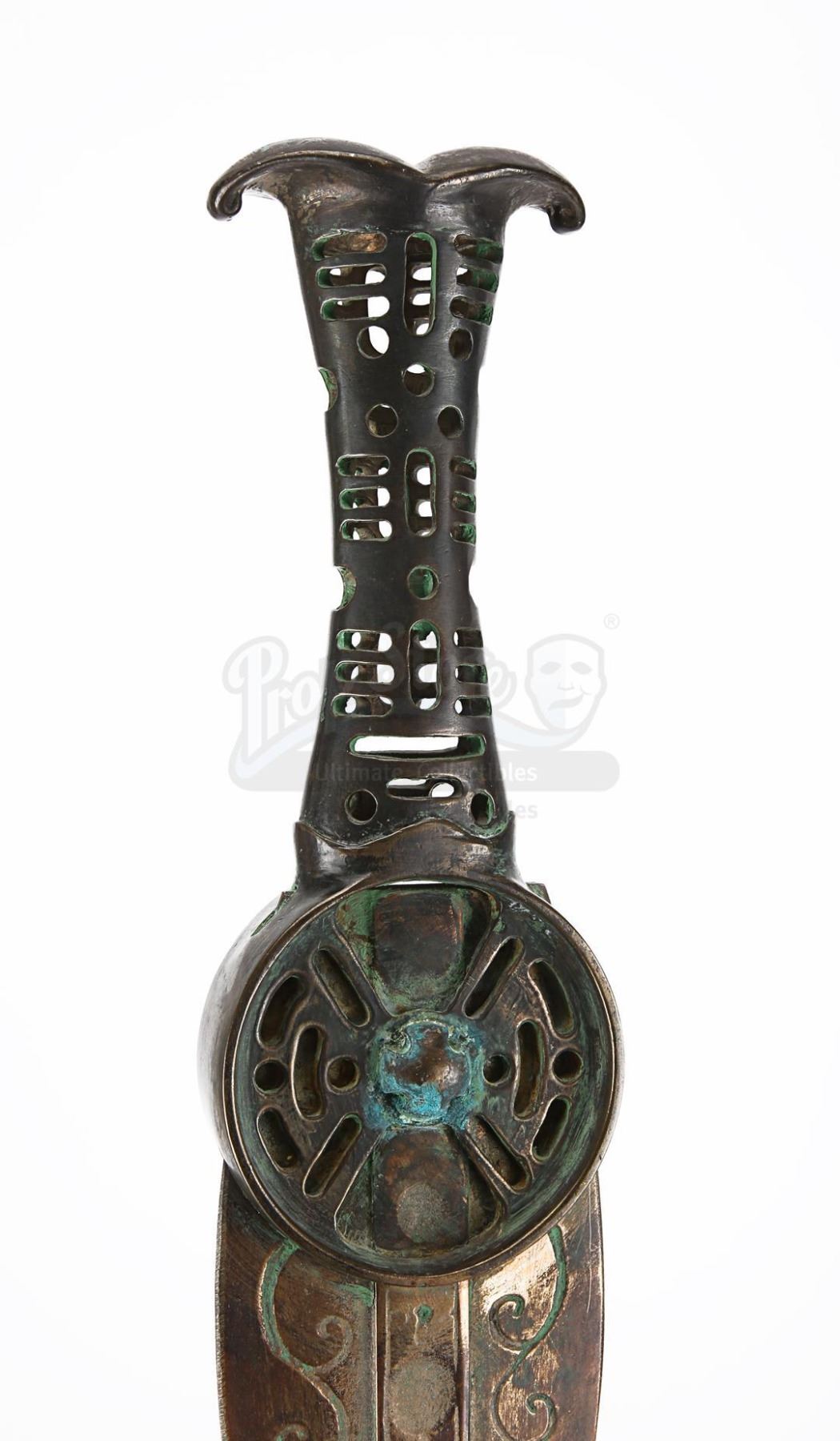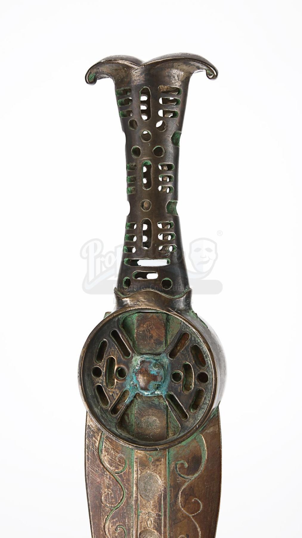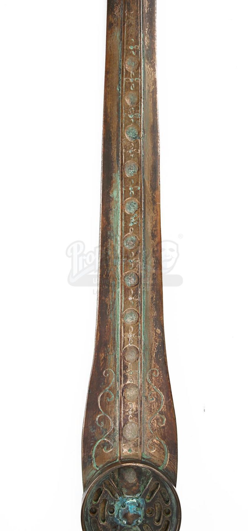 Made from metal finished in faux bronze, the heavyweight sword comprises a round guard, a grip featuring several intricate cutouts, and a fishtail pommel. The blade is decorated with several circular indents and floral-style emblems running down its central raised ridge, and has intricate swirling patterns situated at its base. Shades of green paint replicating a verdigris patina have been skillfully applied to the handle and base of the blade to imply age and corrosion.