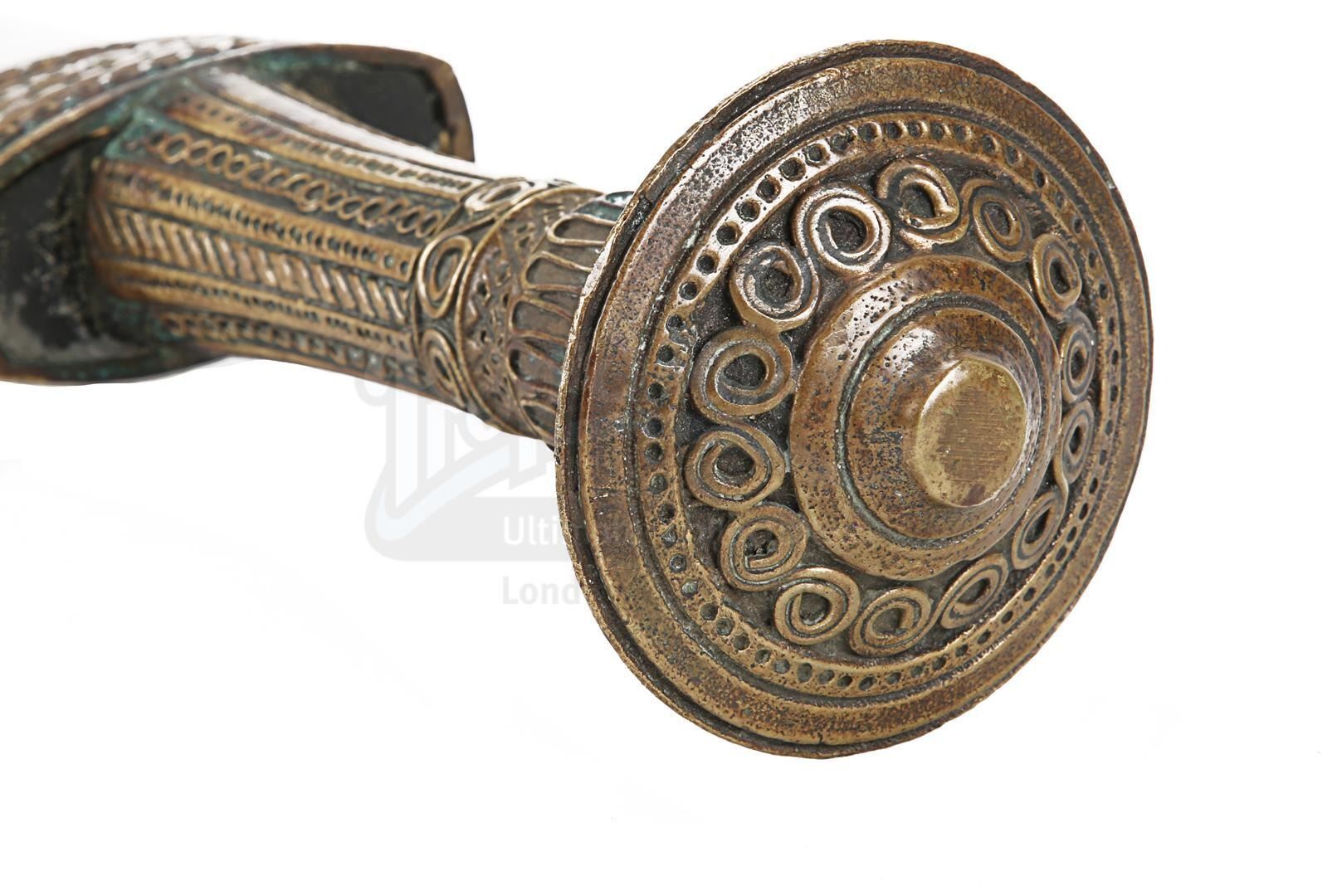 The bronze sword features a metal blade and hilt. The hilt is ornately patterned, and the weapon has a thick guard and pommel. It shows some discolouration and tarnishing from production use and age, most notably at the base of the blade and on the handle, which displays signs of verdigris. Dimensions: 73 cm x 7.5 cm x 7 cm (28 3/4" x 3" x 2 3/4")
