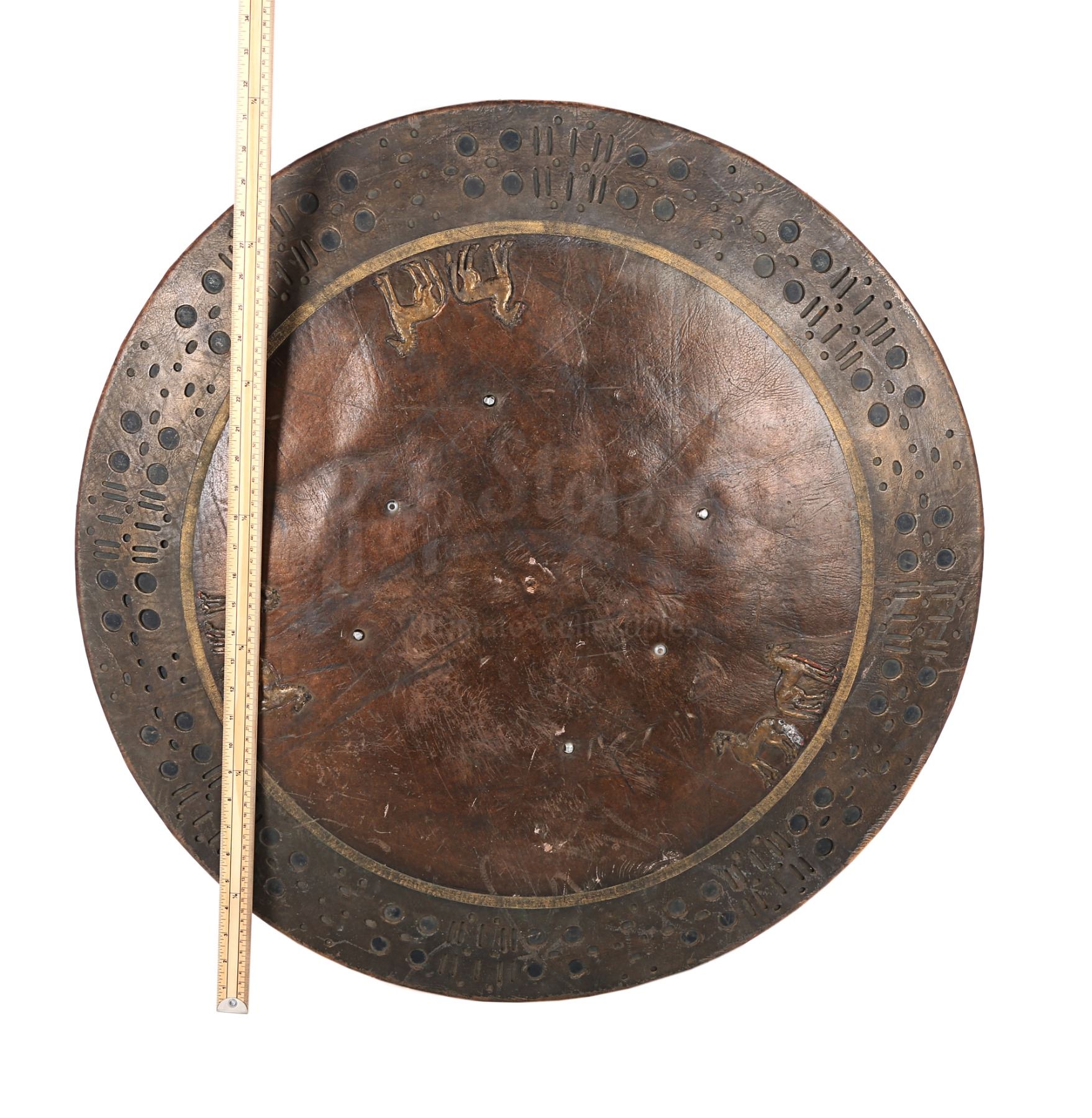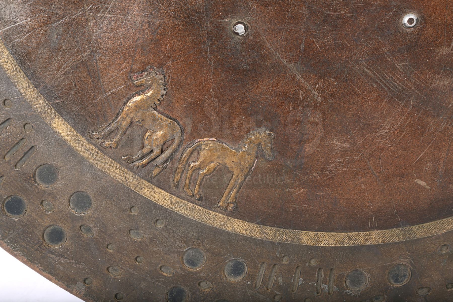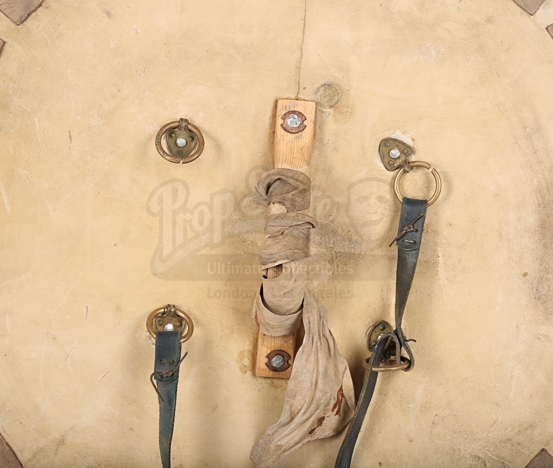 Made of wood covered in brown leather, the front of the shield is decorated with three pairs of raised horse emblems, and has laser cut-out patterns around its outside edge. Padding has been added to the back of the shield, providing comfort for the actor. A wooden handle wrapped in light brown suede is affixed to the back, alongside a thick leather strap and four faux-gold metal rings. The lot has been intentionally distressed to look battle worn and exhibits minor wear and light scuffs at its centre. Dimensions: 81.5 cm x 81.5 cm x 11 cm (32" x 32" x 4 1/4")