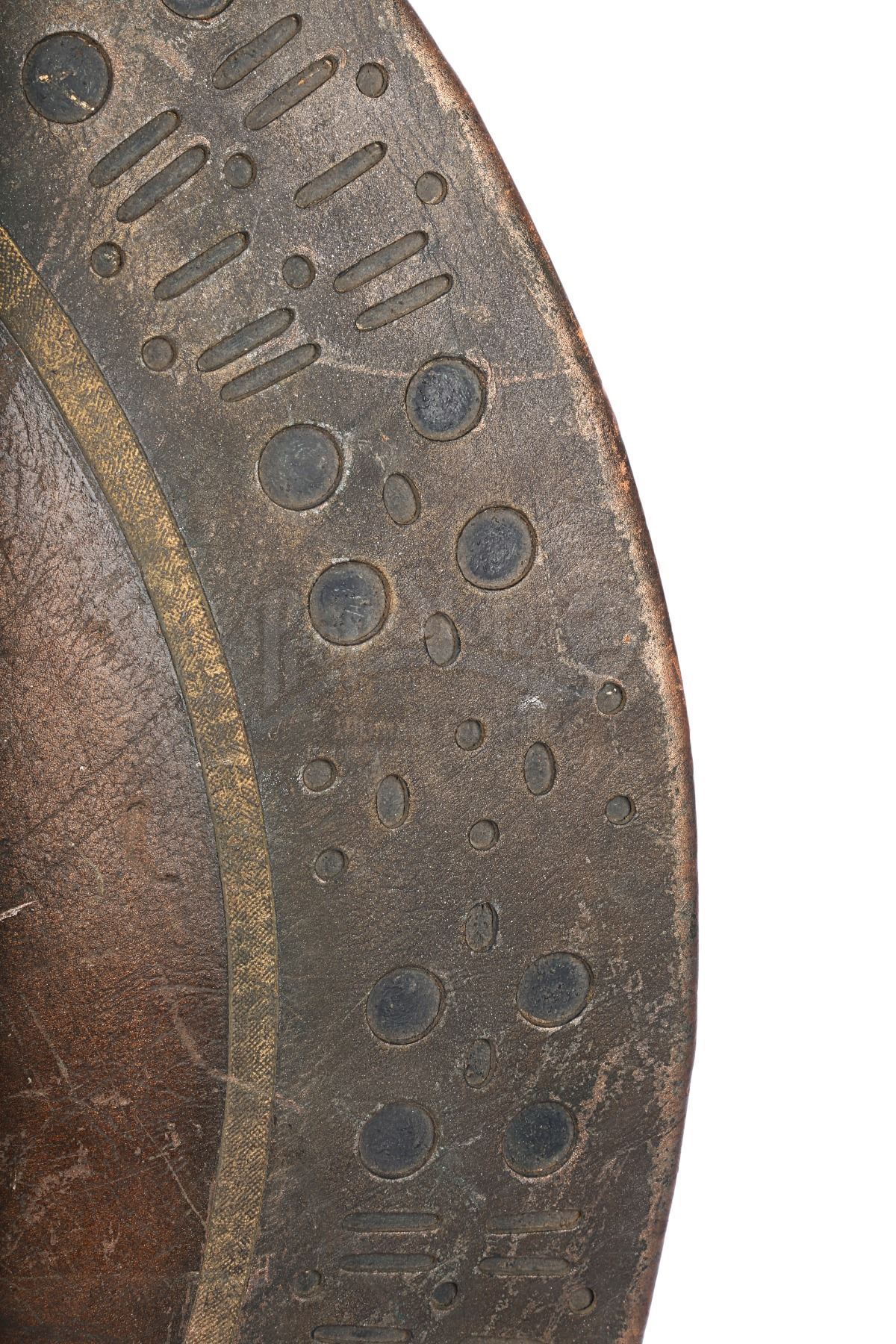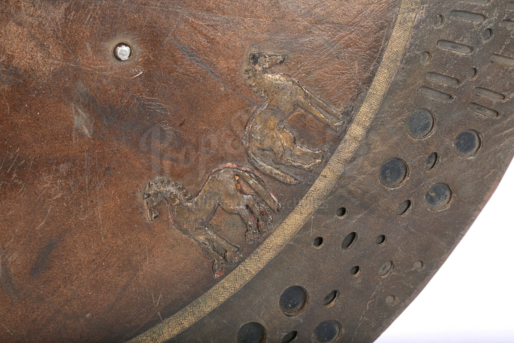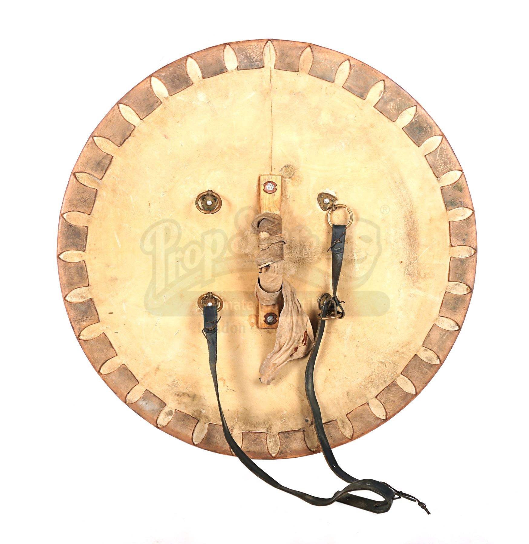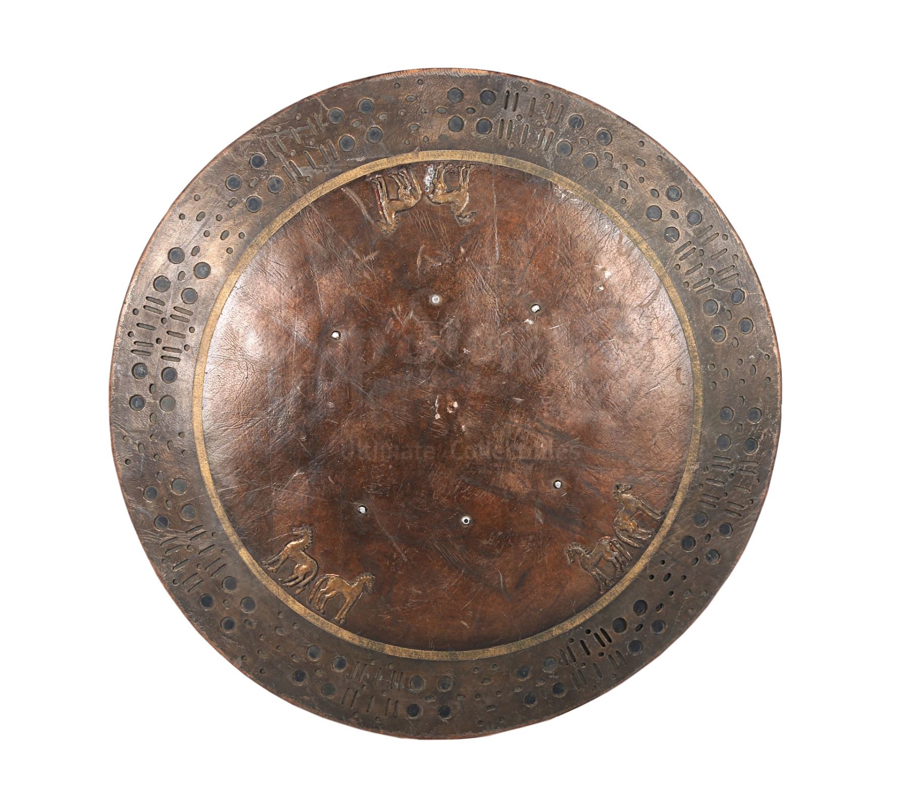 Made of wood covered in brown leather, the front of the shield is decorated with three pairs of raised horse emblems, and has laser cut-out patterns around its outside edge. Padding has been added to the back of the shield, providing comfort for the actor. A wooden handle wrapped in light brown suede is affixed to the back, alongside a thick leather strap and four faux-gold metal rings. The lot has been intentionally distressed to look battle worn and exhibits minor wear and light scuffs at its centre. Dimensions: 81.5 cm x 81.5 cm x 11 cm (32" x 32" x 4 1/4")