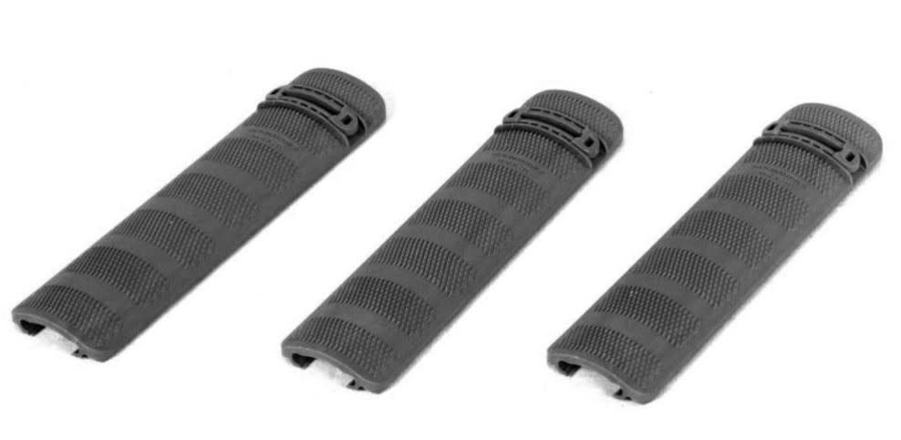 TROY BattleRail Covers easily slide onto a Mil-Std Picatinny rail and lock into place with a built-in retaining clip and can be adjusted with a bullet tip; no tools required. Constructed from durable, heat and chemical-resistant synthetic polymer resin, each rail cover is scientifically engineered and proven to reduce heat transfer and hand abrasions.