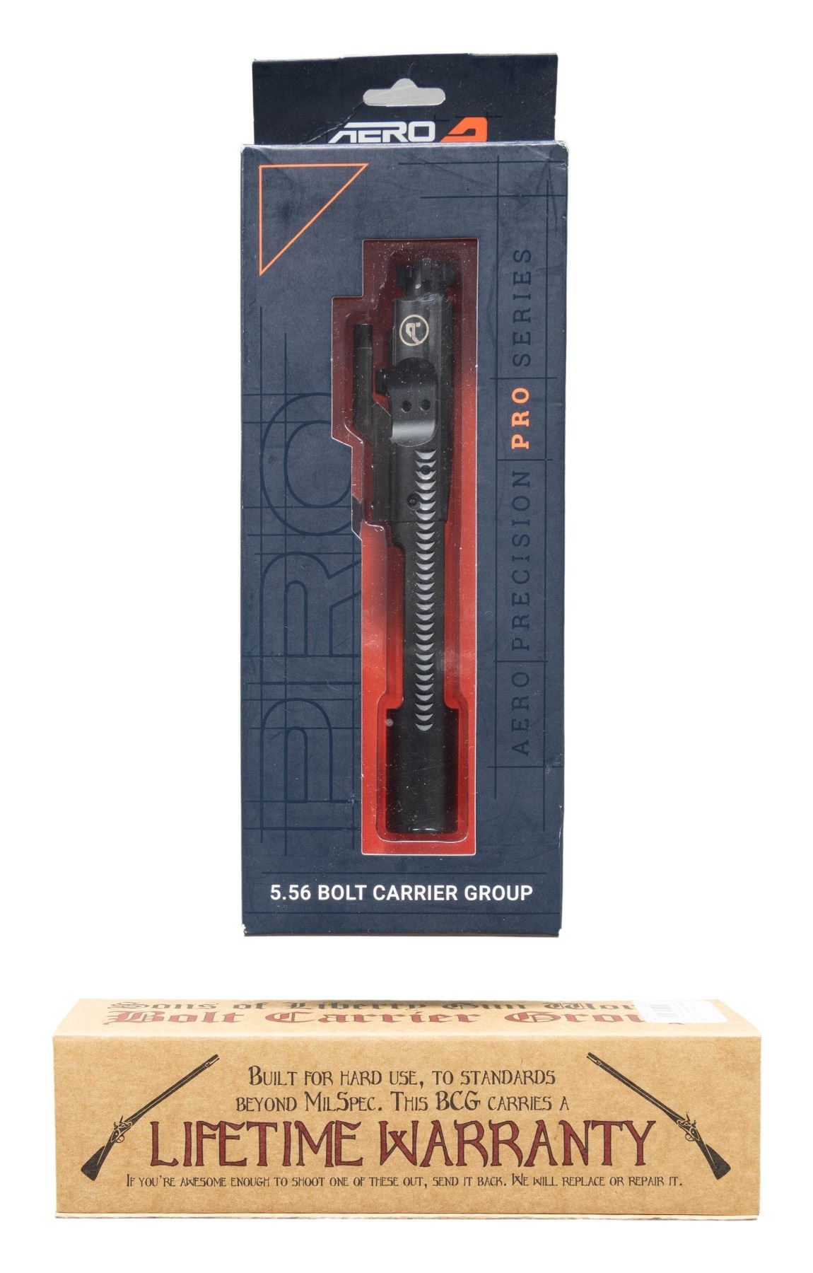 PLUS 2 BCG'S. All items are new in original packages. Troy complete upper with Troy flip up sights on its full Picatinny rail. Fluted 12.5" barrel with flash hider. Part number SUPG-3AC-12BT-23. / Sons of Liberty Gun Works hard chromed BCG. / Aero Precision Pro Series black BCG. (02-25186-1/NW). $650-900.