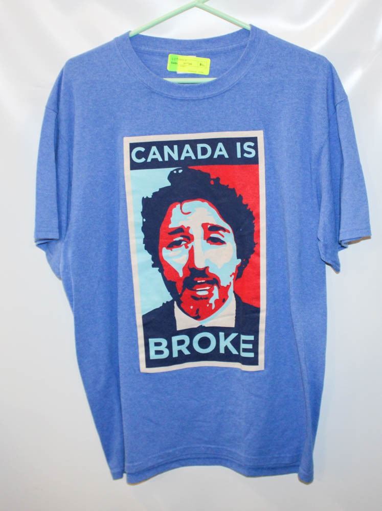 T-SHIRT "CANADA IS BROKE" TRUDEAU JOKE SHIRT. SIZE L