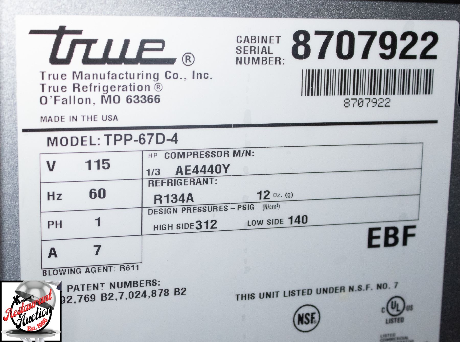 MODEL # TPP-67D-4, 115 VOLTS, 60 HZ, PHASE 1, 7 AMPS, REFRIGERANT R134A, 67" X 32" X 39" * DOES NOT COOL TO FOOD SAFE TEMPERATURES MAY NEED A COLLANT RECHARGE *