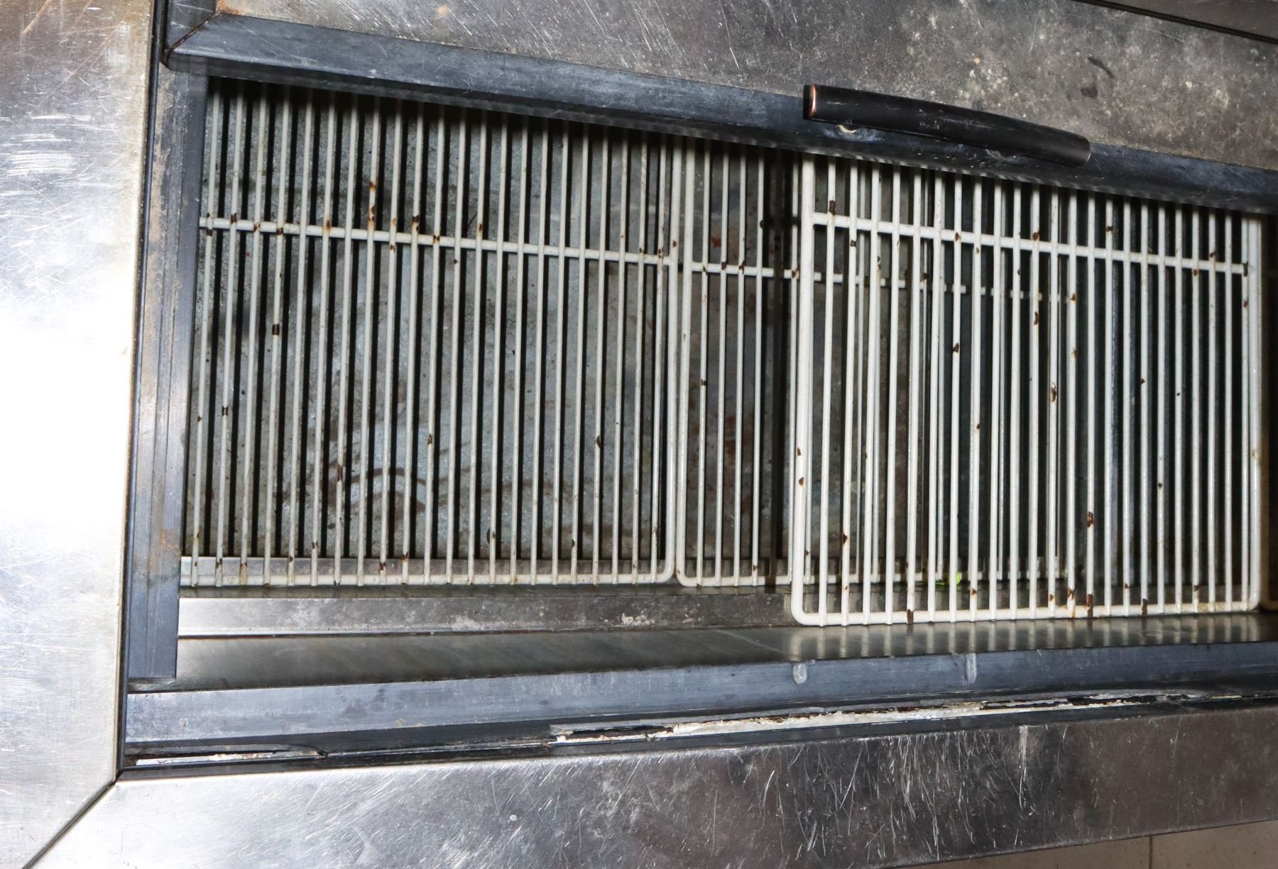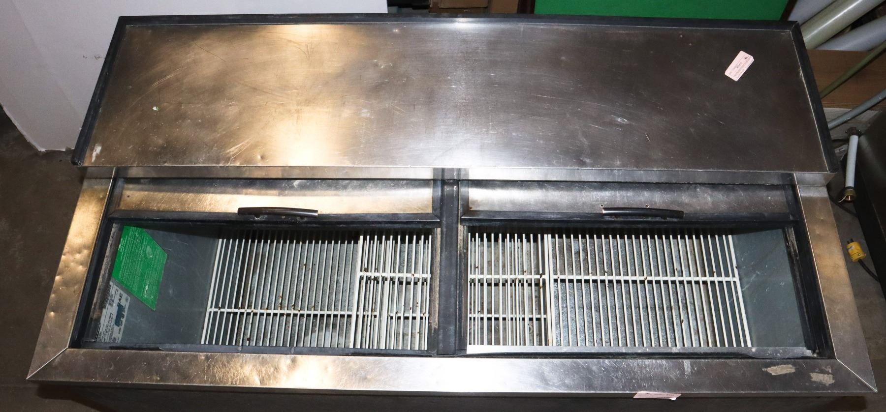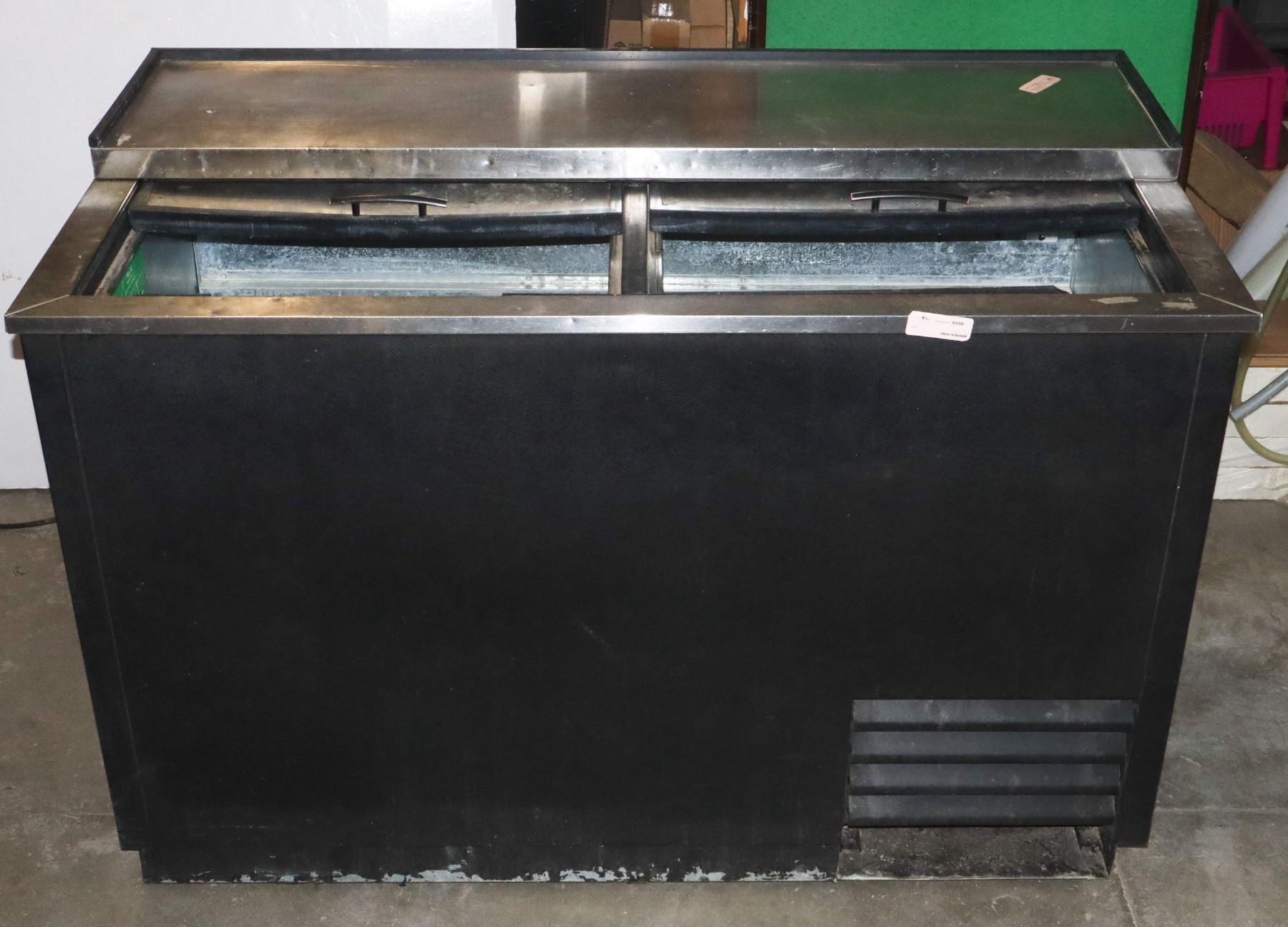 ON LEGS, NOT WHEELS. APPROX 50" WIDE X 34" TALL X 26.5" DEEP. PLUGGED IN, FANS AND COMPRESSOR WORKING.