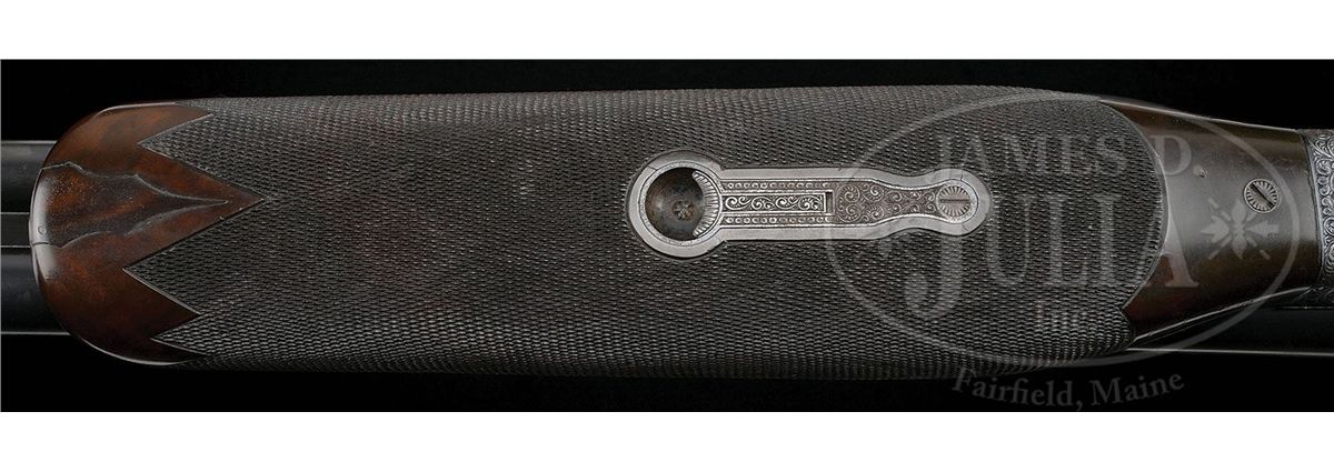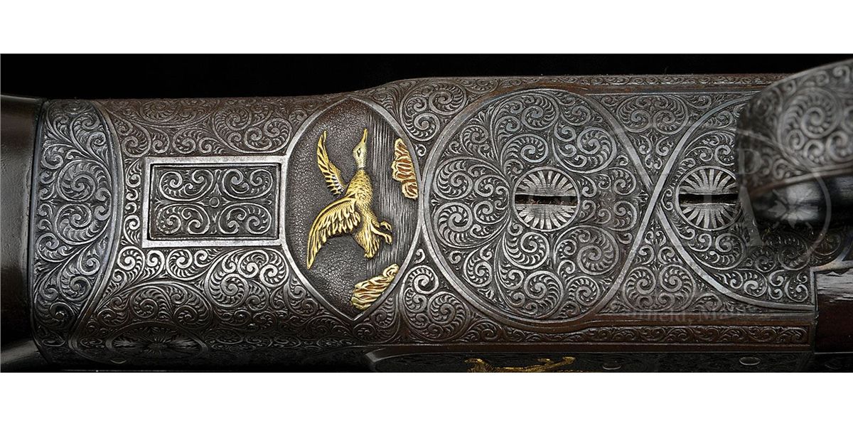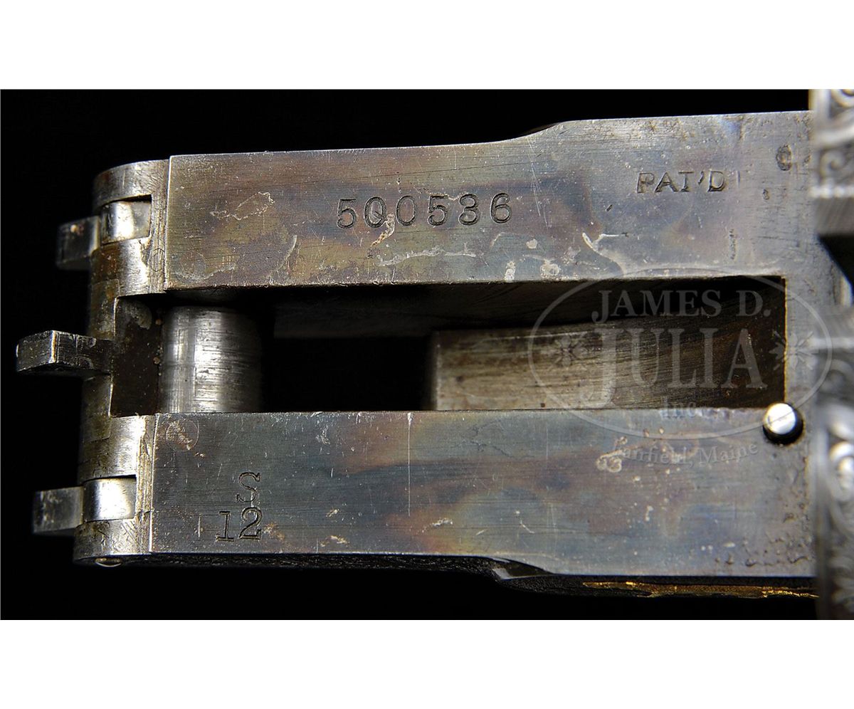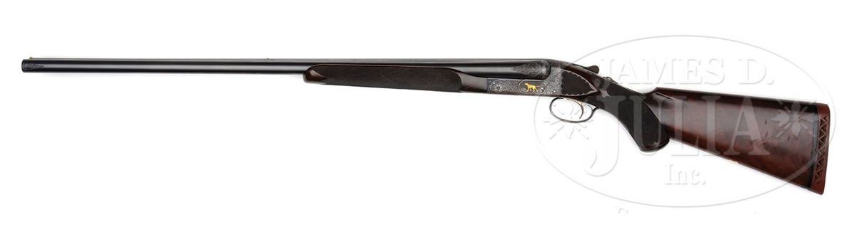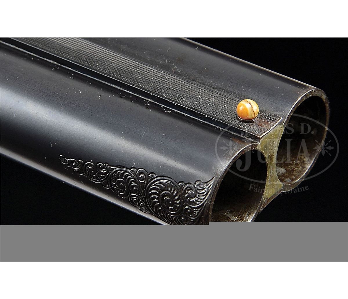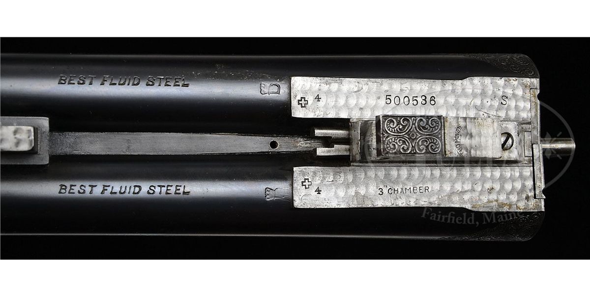 SN 500536. Cal. 12 ga. 3" Chambers. Of 87 12-ga magnum guns produced, this is the only one listed by Walter Snyder as a $1000 grade, and referred to by SN on p. 71 of his THE ITHACA GUN COMPANY FROM THE BEGINNING. It has 30" bbls with matted game rib fitted with two ivory beads, engraved "Ithaca Gun Co." and "Ithaca, N. Y U.S.A." on tops. Breech ends are engraved with 1-7/8" triangles of well cut, deep relief, medium scroll. Engine turned bbl flats are stamped with SN, "S" (Sousa), "3" CHAMBER", with a cross on each bbl, along with a "4". Bottom of lump is stamped "Nitro Powder". Bottoms of bbls are stamped with a crowned "D", and "BEST FLUID STEEL". There are also 1" triangles of engravings at sides of muzzles. Case hardened, special magnum, NID action does not have pin cocking indicators, but is fitted with gold-plated single selective trigger with "R", "S", and "L" gold inlaid on top tang in front of specially shaped safety button. Water table is stamped with SN, "S" and gauge. Action is crisply filed and engraved with exceptional, relief, medium scroll with ribbons running through pattern framing full relief gold inlaid dogs and game in extensively shaded vignettes, giving dramatic depth to subjects; a pointer is on left side, a setter on right, and a duck flies over marsh with gold inlaid reeds below, on bottom of action. Scroll engraved trigger guard bow is gold inlaid with classic Sousa grade jubilantly proud bare chested mermaid. SN is at grip. The scroll engraving on this gun, is a cut above that on the Sousa grade pictured in THE ITHACA GUN, both in complexity and execution. Very dense, flame figured American walnut full capped pistol grip buttstock measures 14-5/8" over Hawkins red open-sided pad. Checkered side panels and 32LPI checkering at grip have arcaded borders. Matching beavertail ejector forend has inset fancy rosewood tip, and J-spring, as well as Deeley type secondary release. Interior of forend iron is line border engraved with some scroll on latch parts, and is stamped with SN, and "S". Bore diameter: left-.734, right -.734. Bore restrictions: left -.042 (Extra full), right -.026 (IM). Wall thickness: left -.031, right -.036. Drop at heel: 2-1/2", drop at comb: 1-5/8". Weight: 9 lbs. 4 oz. LOP: 14-5/8". PROVENANCE: Ithaca Gun Co invoice for this gun listed as $1000 grade, dated Nov 15, 1938, and sold for $1000.00 plus extras, including beavertail forend at $21.65, recoil pad at $2.25, and ivory sights at $1.10, for a total of $1025.00 to E. J. Britt of Lumberton, NC. Extras are then scratched out and have a penciled in notation stating: "Sent corrected Inv. 11/17" for a total of $1000.00. CONDITION: Excellent. as found. Bbls retain approx 95% orig blue, thinning around breech, with some light and scattered freckling, has not been cleaned. Action retains most of its dark case hardening colors, percentage difficult to ascertain, because of depth of engraving. High points of engraving are pleasingly silvered. Rear of top tang, thumbpiece of top lever, left part of bottom of action, and rear of trigger guard bow are brown patina. Trigger retains a considerable amount of its gold-plating. Stocks retain nearly all of their orig finish, which is slightly crazed and frosted, with a number of light marks and scratches. Checkering is slightly worn and dark. Bores are excellent, bright and shiny throughout. Action is tight, with top lever right of center. Ejectors are slightly out of time. Trigger works. An incredibly rare investment quality Ithaca. 4-49726 MGM307