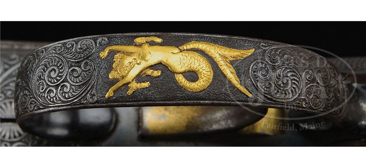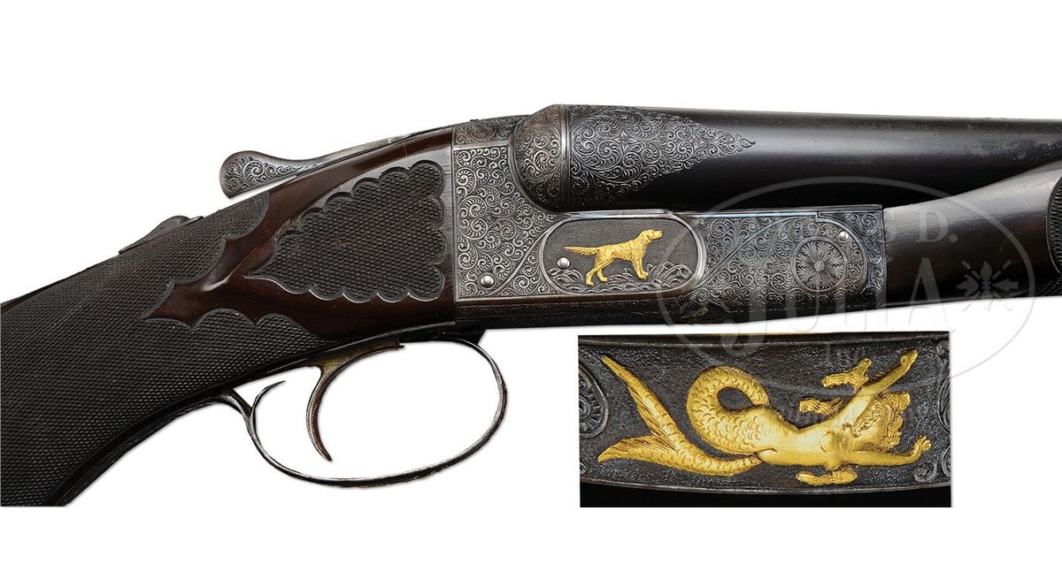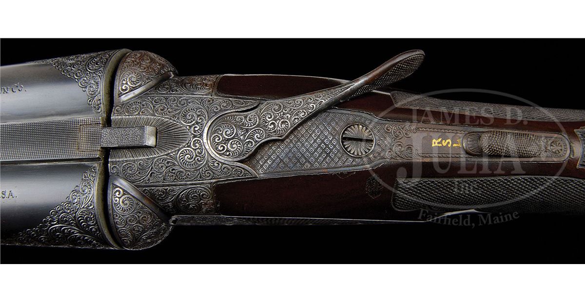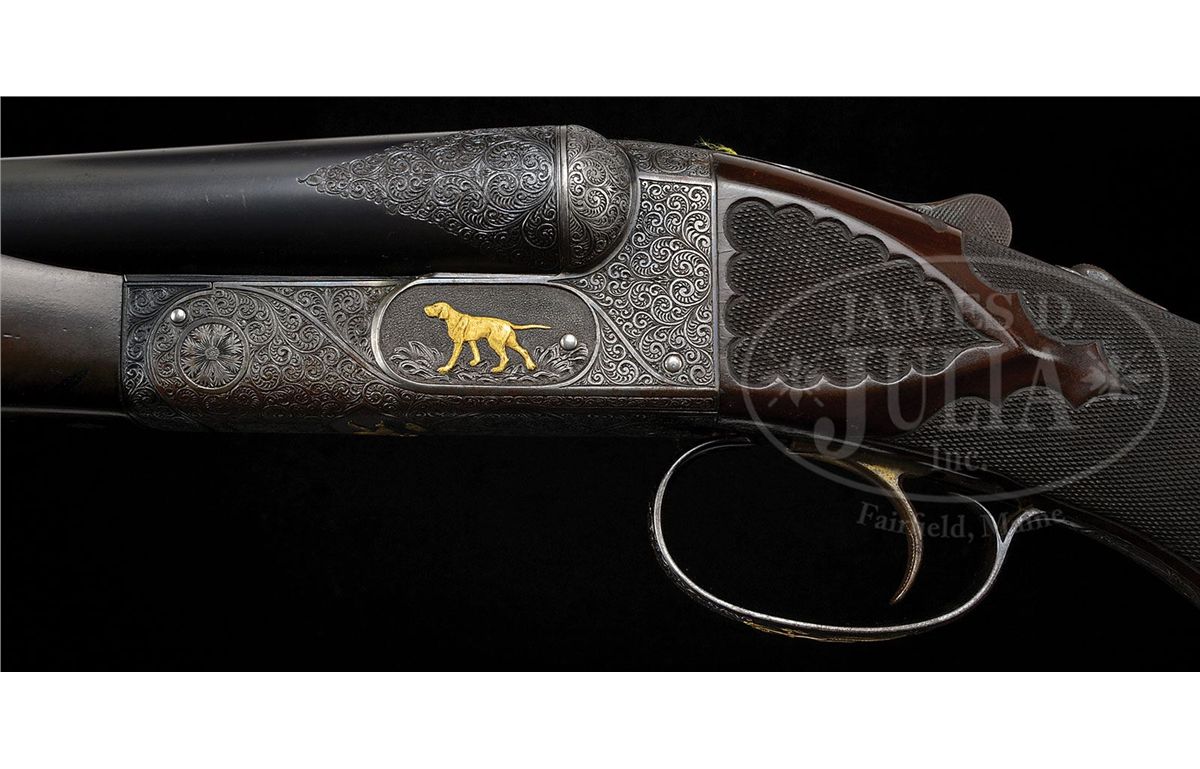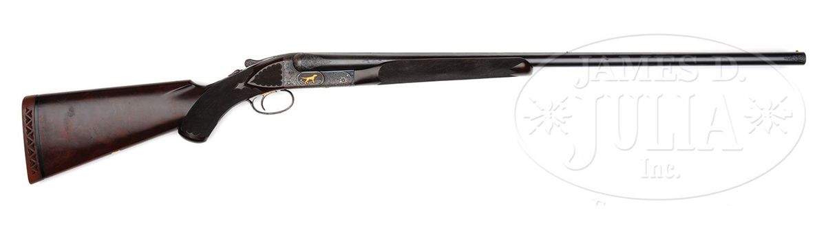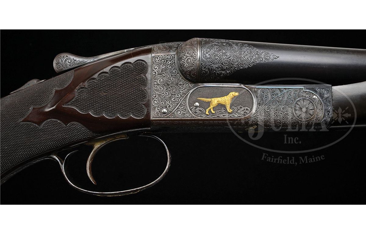 SN 500536. Cal. 12 ga. 3" Chambers. Of 87 12-ga magnum guns produced, this is the only one listed by Walter Snyder as a $1000 grade, and referred to by SN on p. 71 of his THE ITHACA GUN COMPANY FROM THE BEGINNING. It has 30" bbls with matted game rib fitted with two ivory beads, engraved "Ithaca Gun Co." and "Ithaca, N. Y U.S.A." on tops. Breech ends are engraved with 1-7/8" triangles of well cut, deep relief, medium scroll. Engine turned bbl flats are stamped with SN, "S" (Sousa), "3" CHAMBER", with a cross on each bbl, along with a "4". Bottom of lump is stamped "Nitro Powder". Bottoms of bbls are stamped with a crowned "D", and "BEST FLUID STEEL". There are also 1" triangles of engravings at sides of muzzles. Case hardened, special magnum, NID action does not have pin cocking indicators, but is fitted with gold-plated single selective trigger with "R", "S", and "L" gold inlaid on top tang in front of specially shaped safety button. Water table is stamped with SN, "S" and gauge. Action is crisply filed and engraved with exceptional, relief, medium scroll with ribbons running through pattern framing full relief gold inlaid dogs and game in extensively shaded vignettes, giving dramatic depth to subjects; a pointer is on left side, a setter on right, and a duck flies over marsh with gold inlaid reeds below, on bottom of action. Scroll engraved trigger guard bow is gold inlaid with classic Sousa grade jubilantly proud bare chested mermaid. SN is at grip. The scroll engraving on this gun, is a cut above that on the Sousa grade pictured in THE ITHACA GUN, both in complexity and execution. Very dense, flame figured American walnut full capped pistol grip buttstock measures 14-5/8" over Hawkins red open-sided pad. Checkered side panels and 32LPI checkering at grip have arcaded borders. Matching beavertail ejector forend has inset fancy rosewood tip, and J-spring, as well as Deeley type secondary release. Interior of forend iron is line border engraved with some scroll on latch parts, and is stamped with SN, and "S". Bore diameter: left-.734, right -.734. Bore restrictions: left -.042 (Extra full), right -.026 (IM). Wall thickness: left -.031, right -.036. Drop at heel: 2-1/2", drop at comb: 1-5/8". Weight: 9 lbs. 4 oz. LOP: 14-5/8". PROVENANCE: Ithaca Gun Co invoice for this gun listed as $1000 grade, dated Nov 15, 1938, and sold for $1000.00 plus extras, including beavertail forend at $21.65, recoil pad at $2.25, and ivory sights at $1.10, for a total of $1025.00 to E. J. Britt of Lumberton, NC. Extras are then scratched out and have a penciled in notation stating: "Sent corrected Inv. 11/17" for a total of $1000.00. CONDITION: Excellent. as found. Bbls retain approx 95% orig blue, thinning around breech, with some light and scattered freckling, has not been cleaned. Action retains most of its dark case hardening colors, percentage difficult to ascertain, because of depth of engraving. High points of engraving are pleasingly silvered. Rear of top tang, thumbpiece of top lever, left part of bottom of action, and rear of trigger guard bow are brown patina. Trigger retains a considerable amount of its gold-plating. Stocks retain nearly all of their orig finish, which is slightly crazed and frosted, with a number of light marks and scratches. Checkering is slightly worn and dark. Bores are excellent, bright and shiny throughout. Action is tight, with top lever right of center. Ejectors are slightly out of time. Trigger works. An incredibly rare investment quality Ithaca. 4-49726 MGM307