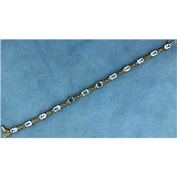 In 14k gold, the necklace contains 56 high quality brilliant cut diamonds. Clarity SI and G color. 18 inches in length. The necklace is 7.5mm wide at