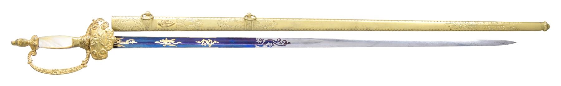 SWORD. Overall length: 37 5/8". Blade length: 30 7/8". This South Carolina militia sword is the finest example we have ever seen. The decorated blade has a single medium fuller extending 16" up from the hilt. It has vivid gold highlighted engraving that includes sprays of arms and foliate motifs, all on a radiant blued field. The ricasso is stamped with a king's head, indicating European manufacture of the blade. Heavy gilded brass hilt with a turned-down guard that features a central motif of palmetto tree with the date "1776" beneath which is the South Carolina state seal. The edges of the guard are attractively scroll decorated. The turned-down quillon terminates in an eagle's head. The entire knuckle bow is scroll decorated and leads into a pommel depicting an armored torso topped by a head wearing a Phrygian cap. Mother-of-pearl grips with the back grip engraved "Fred E. Ranger.". The gilded brass scabbard has foliate decoration over most of the face. The rear of the scabbard is stamped near the throat "425", which is the Horstmann contract number, and "HORSTMANN" in a sunken cartouche.