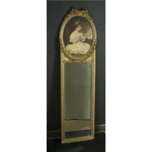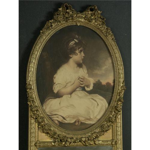 TRUMEAU 62 1/2'' (centerpoint) x 18'' (picture) 17'' (mirror). Beveled mirror in an ornate wood and compo gilt picture frame with a photolithographic insert of a young girl in period dress.