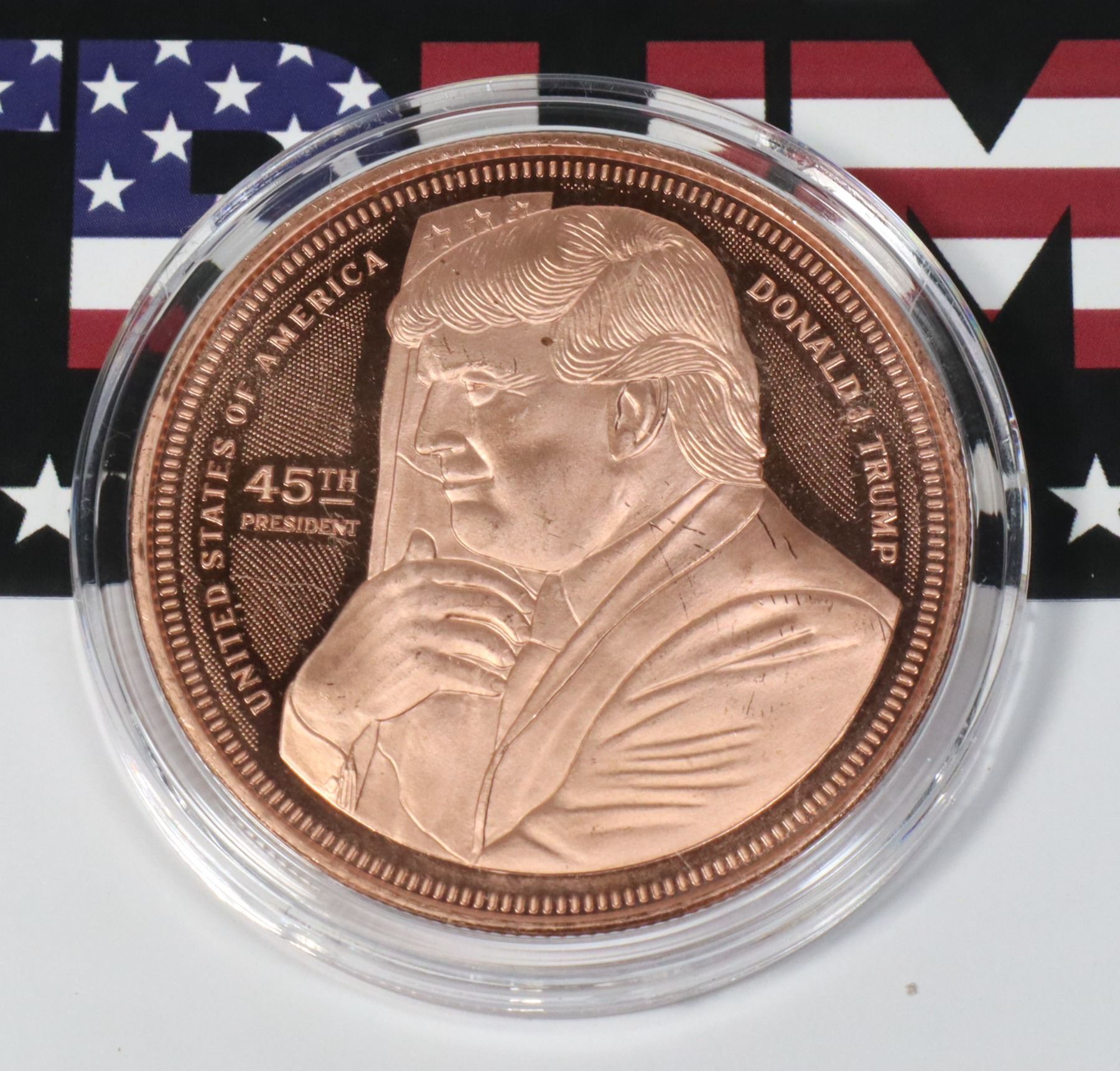 TRUMP HUGGING FLAG 1-OZ COPPER ROUND, PROOF LIKE