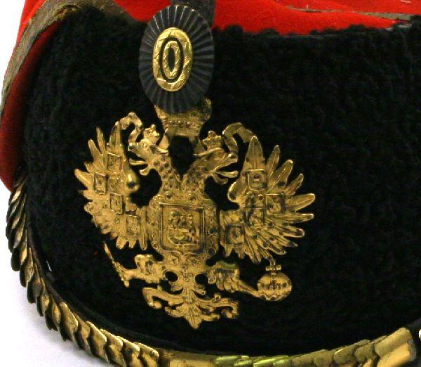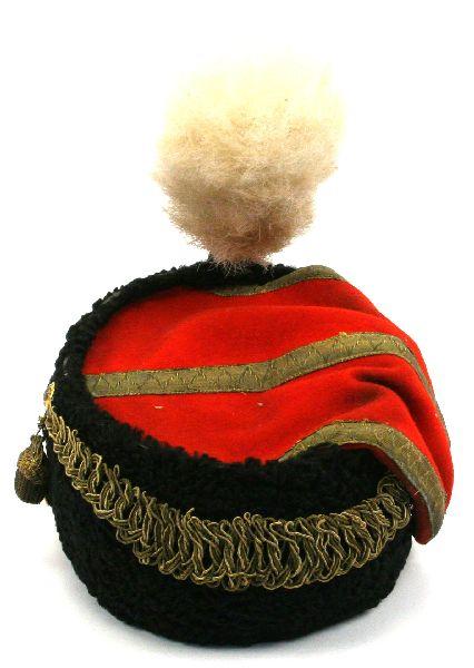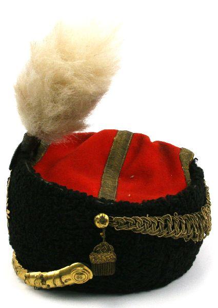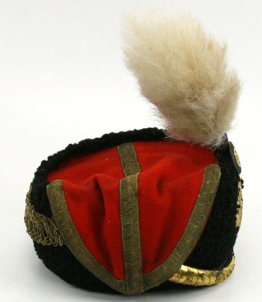 Black Wool body hat with red felt point draped over right hand side with gold trim. Horse hair plume. Regimental emblem. Liner intact and in very good condition. Inside of hat carries many stamps from several museums, with ID numbers. In very good condition.