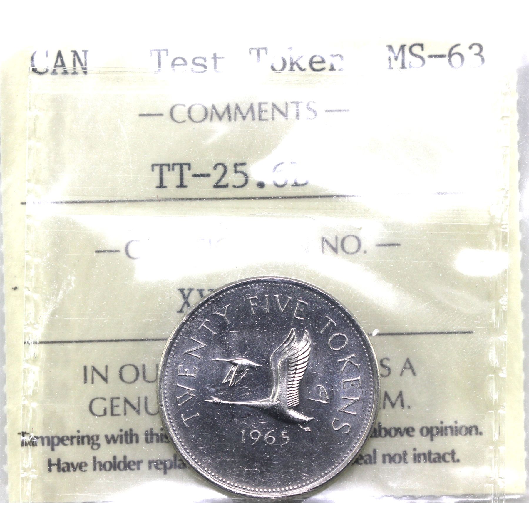 TT-25.6B Test Token 1965 25-cent ICCS MS60. Struck in Nickle with Reeded Edge *RARE TYPE!*