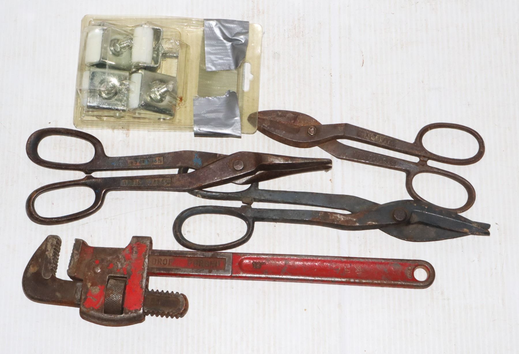 TUB OF TOOLS INCLUDING 18" PIPE WRENCH, SNIPS,