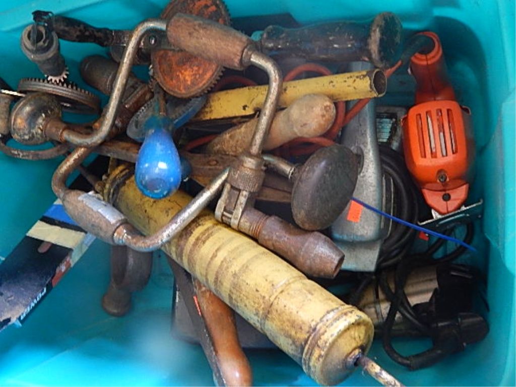 TUB OF VINTAGE DRILLS, BRACES AND OTHER