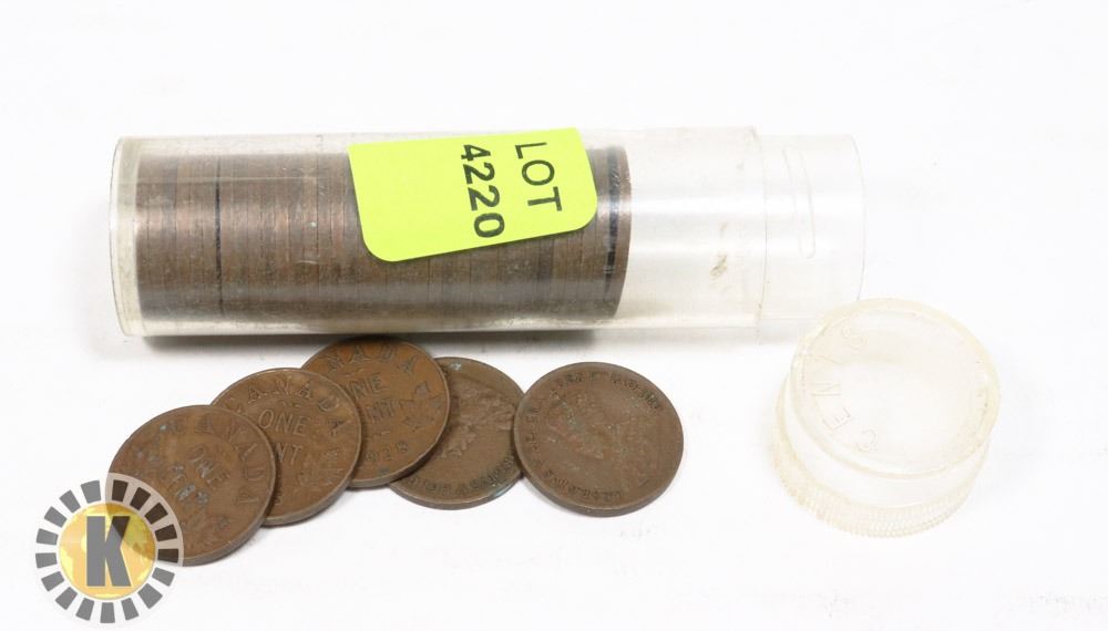 TUBE OF CANADIAN PENNIES, MOST APPEAR TO BE FROM E
