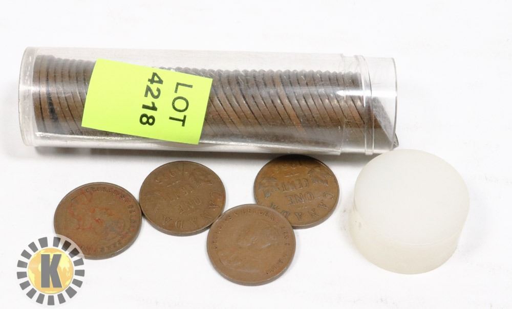 TUBE OF CANADIAN PENNIES, MOST APPEAR TO BE FROM