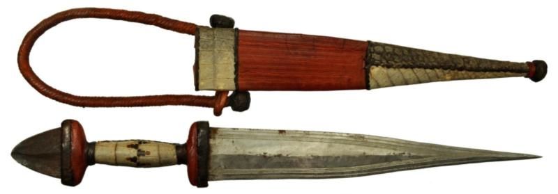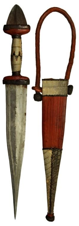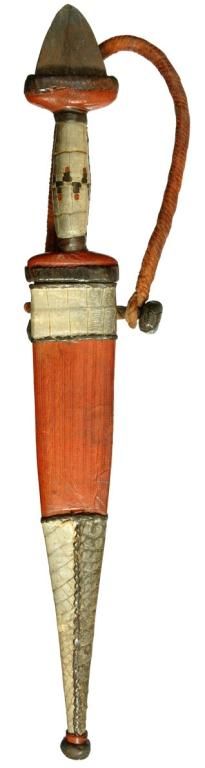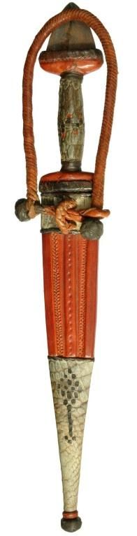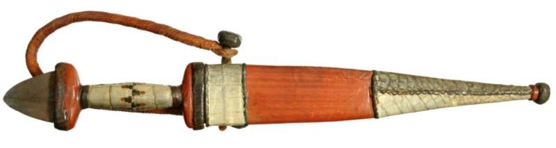 TUBU TRIBE of MALI DAGGER, the blade is double edged and measures 8.25. The handle and sheather, made from reptile skin. Contained in the original tooled leather sheath with some reptile skins wrapped around, complete with arm strap. Overall 13? inch