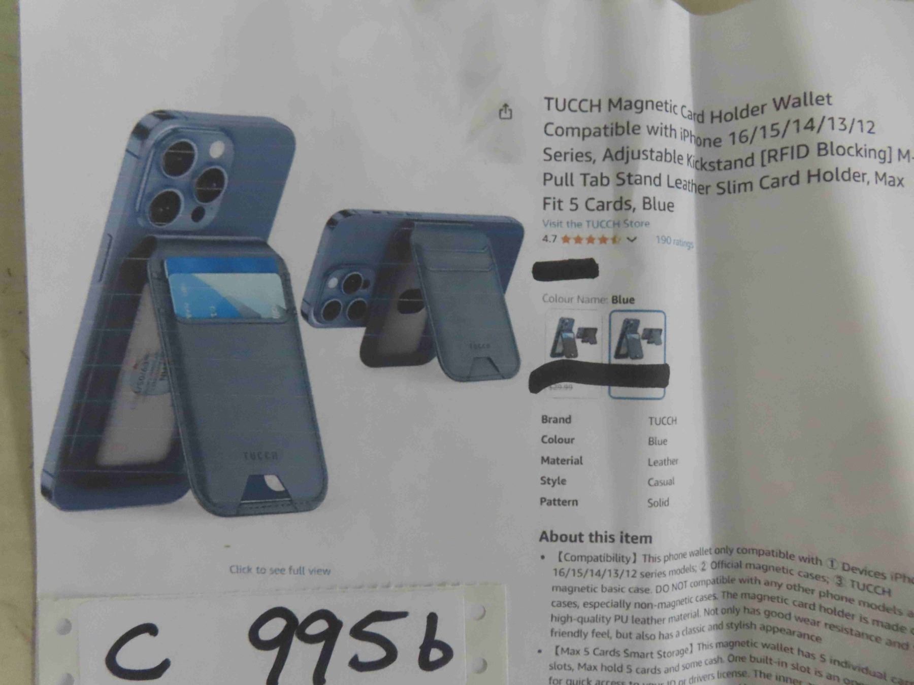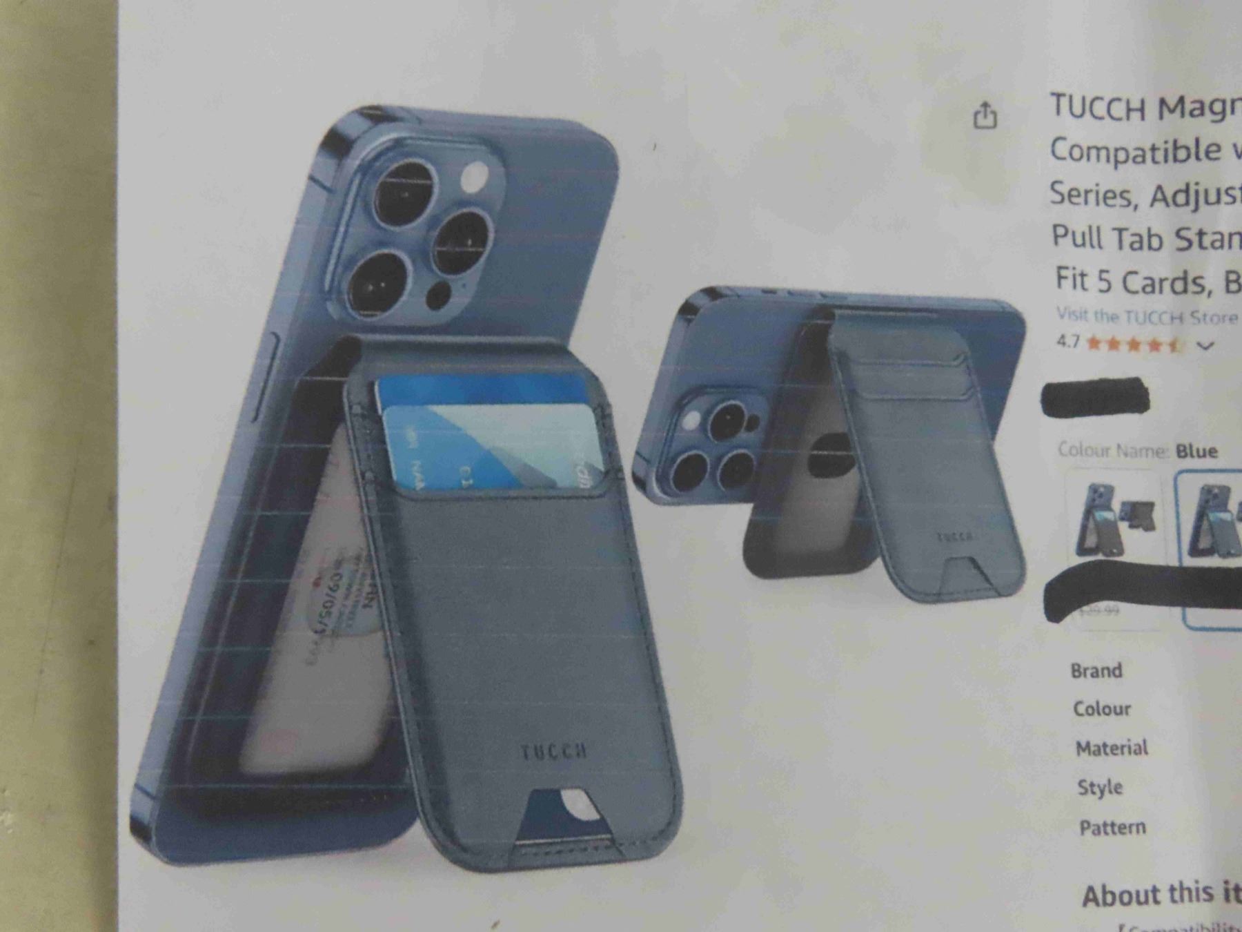 TUCCH Magnetic Card Holder Wallet Compatible with iPhone 16 pro max Series, Adjustable Kickstand [RFID Blocking] M-Pull Tab Stand Leather Slim Card Holder, Max Fit 5 Cards, Blue - New or Store Return