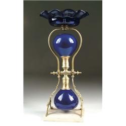 TUFT’S AUTOMATIC CRYSTAL FOUNTAIN. From the makers of the famous Tuft’s soda fountains comes this rare Victorian perfume fountain, which was used as both novelty entertainment and an air freshener. The assembly consists of a cobalt blue glass basin and globes (also sold in cranberry) on a brass frame, all resting upon a polished white marble base. Pat. Feb. 7, 1872 by the J.W. Tufts Co., Boston, Mass. SIZE: Overall height 22” h. CONDITION: One globe has hairline where it attaches to the brass fitting; otherwise, very good-excellent. PF 1-4444 (2,500-4,500)