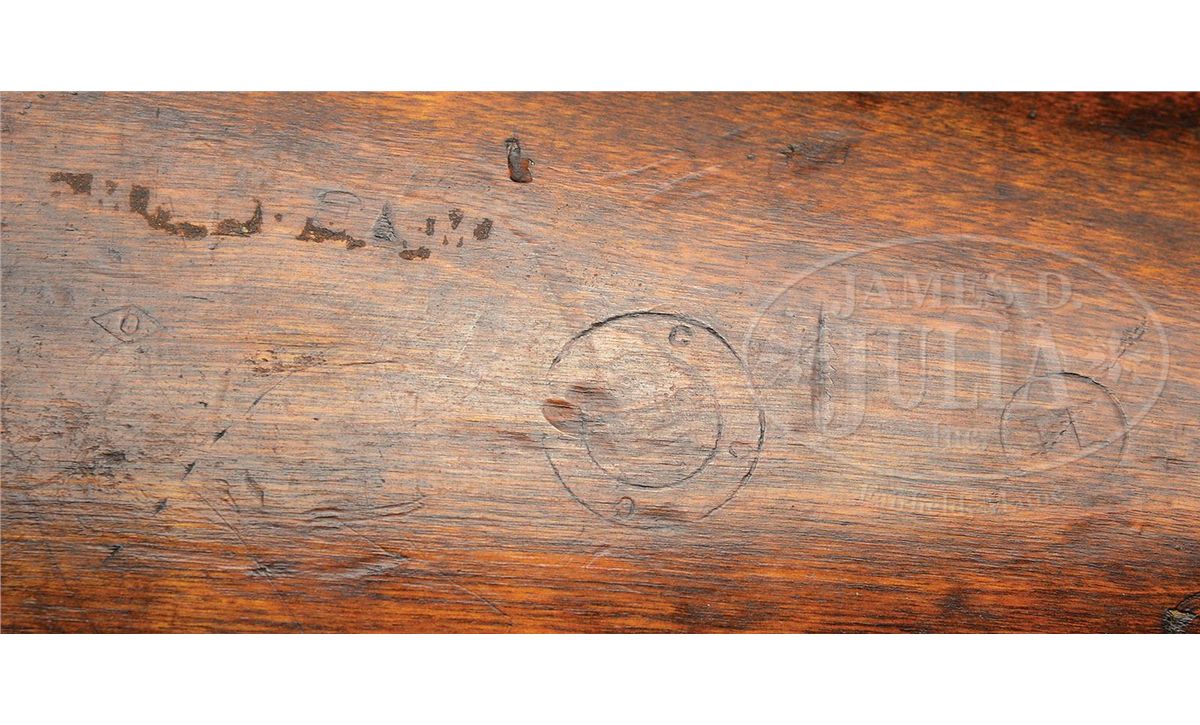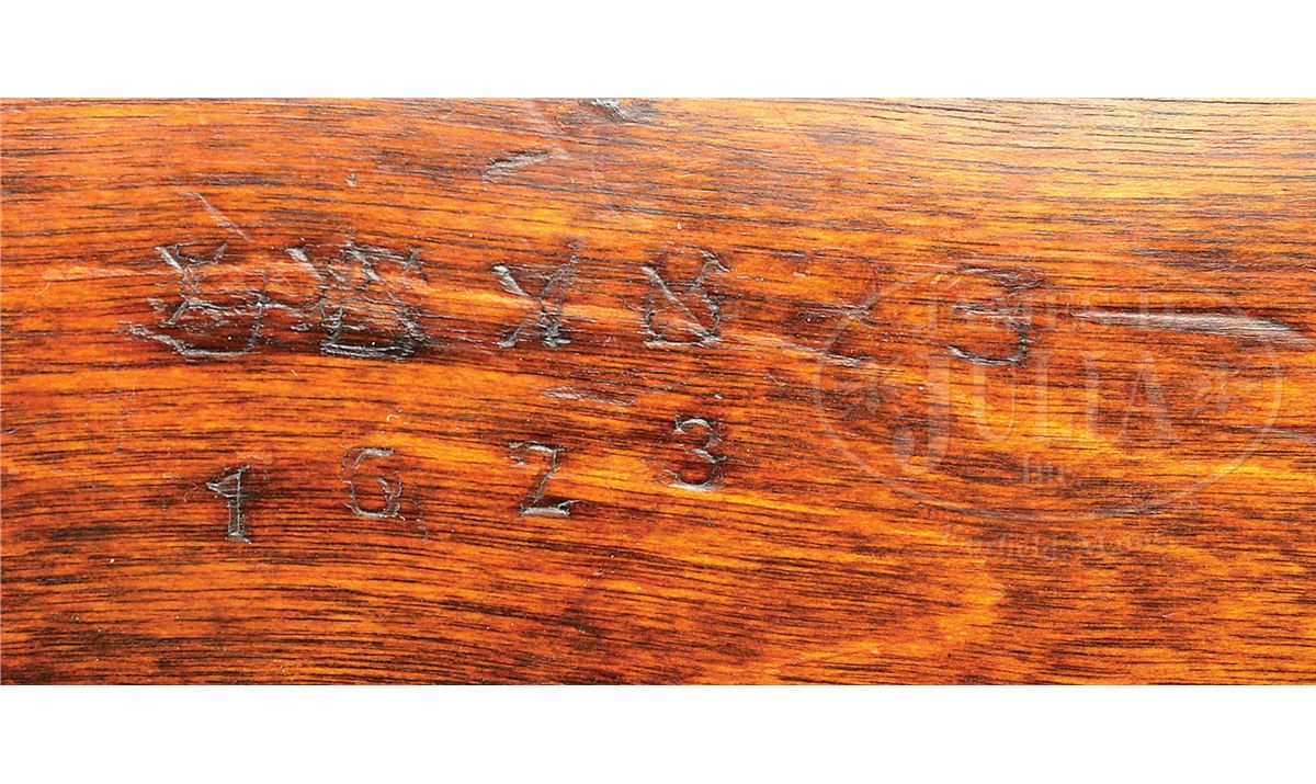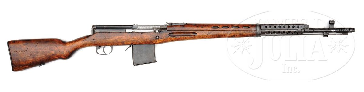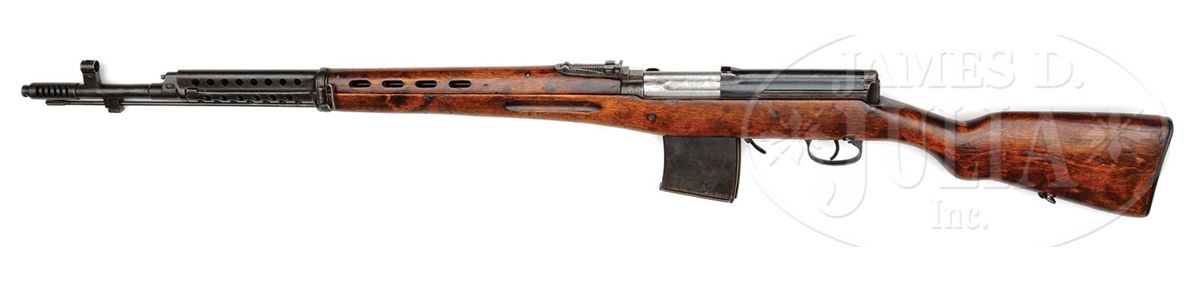 SN 7b1623. Cal. 7.62 x 54R mm. Early WWII Soviet SVT40 as captured and used by the Germans during the war. This exact rifle appears second from top on inside cover of Darrin Weaver's 2001 Hitlers Garands. Top of the receiver is marked with Tula proof and dated 1940. Has additional scope mount rails machined in rear of receiver. Bore is dark but should clean up. All metal parts that should be serial numbered match the receiver with the exception of the magazine. Hardwood stock shows scattered handling dings and marks. Soviet proofed in a number of places and bears an additional Nazi era Eagle/Su27 proof at wrist indicating German capture and arsenal inspection for reissue. This rifle was not arsenal refinished after the war by the Soviets as nearly all SVT40's were that are seen on the commercial market. Very scarce, early 1940 production SVT40 with genuine German ordnance acceptance and use. PROVENANCE: Collection of Dr. Geoffrey Sturgess. CONDITION: 80% bluing with scattered areas of patina and wear on high edges. 4-53226 DW7