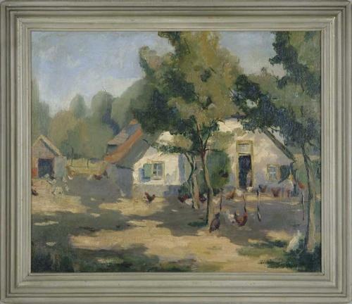 TUNIS PONSEN (American, 1891-1968) "A DUTCH FARMHOUSE". Oil on canvas farmyard scene shows a white stucco house with open yard having many chickens. A girl is seen on right side of house and figure is in doorway. Signed lower right. Housed in its original painted over gilt molded wood frame. There is a Detroit Institute of Art exhibit label with title and artist. Also identified and titled on stretcher. SIZE: 20" x 24". CONDITION: There is a 1-1/2" slit in sky, otherwise very good. 9-27661